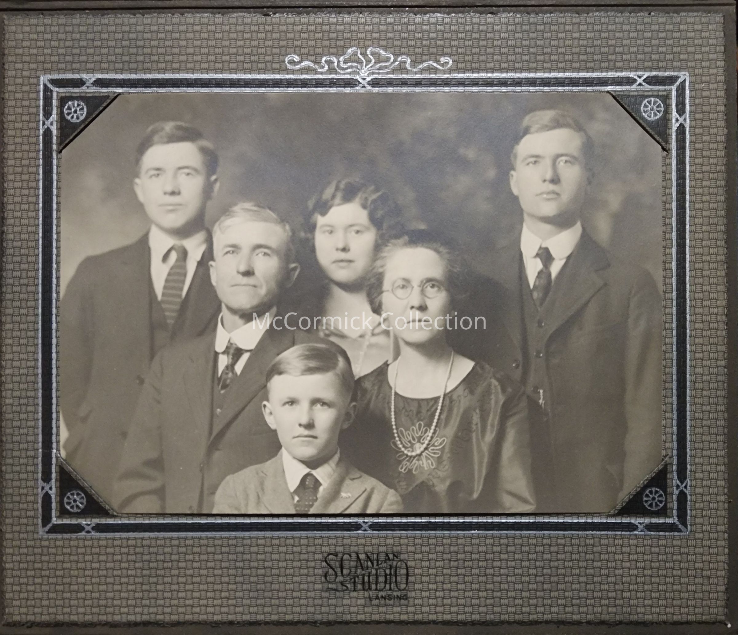 Folder frame mounted photograph of an unidentified family by Lansing photographer Scanlan Studio.