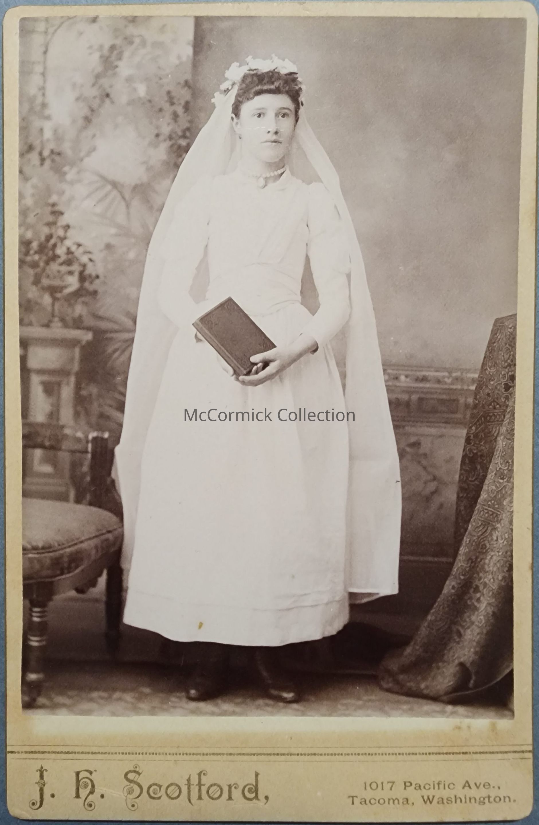 Cabinet card photograph of an unknown woman by John Harvey Scotford, Lansing photographer here later working in Tacoma, WA. Circa 1890s.Made/Created