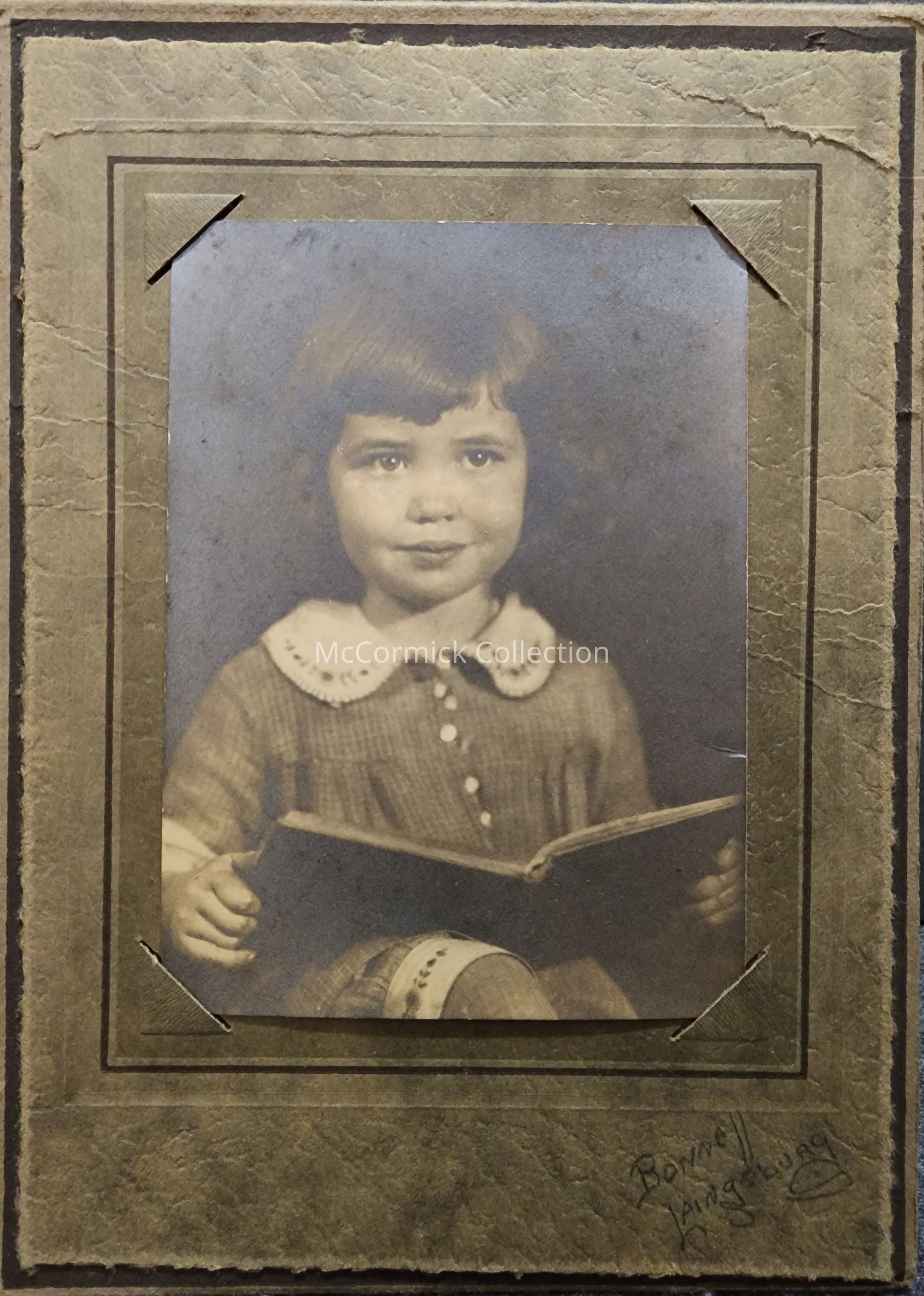 Folder frame mounted photograph of an unidentified girl with a book by photographer Bonnell of Laingsburg, also worked in Lansing.