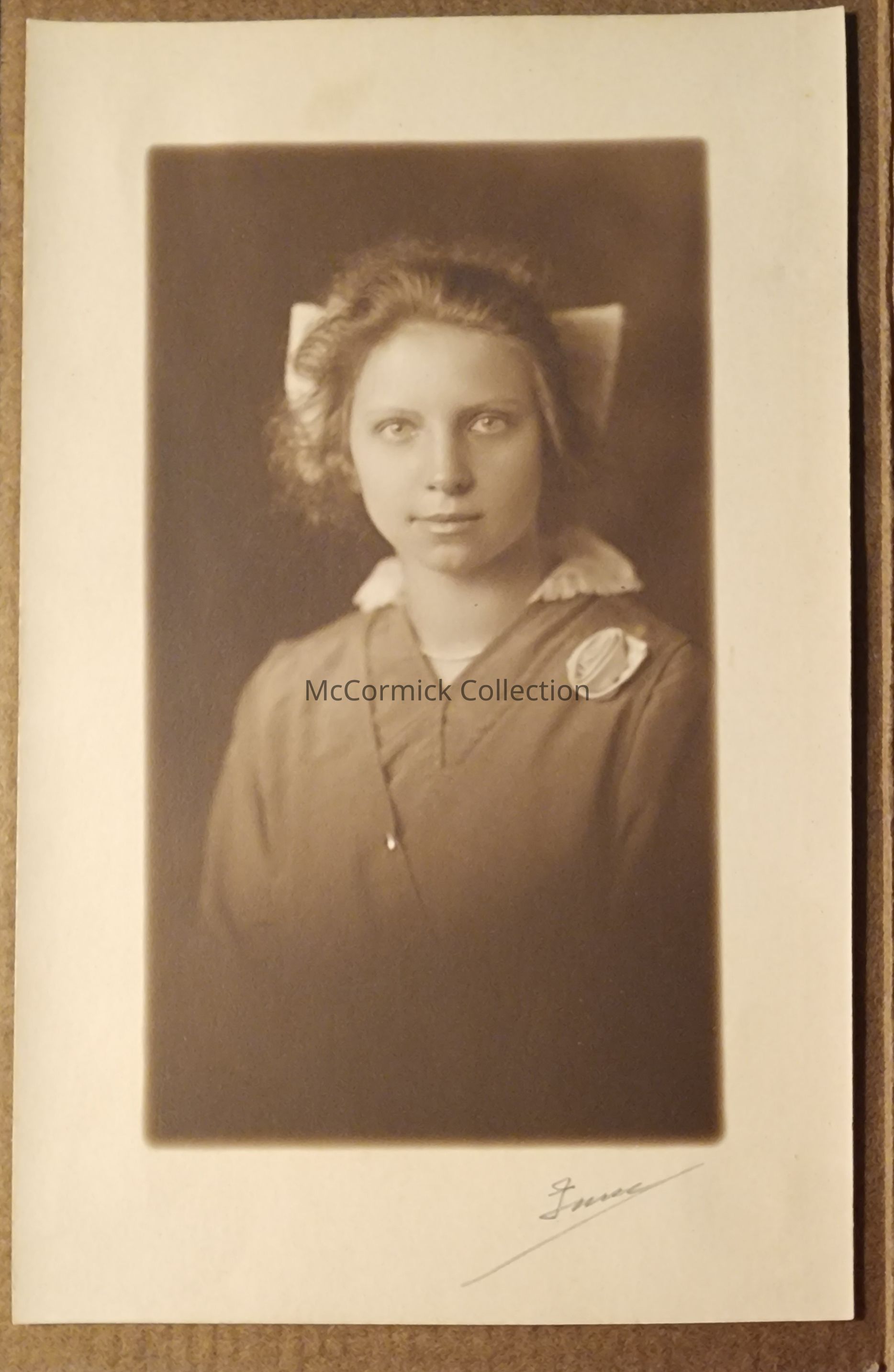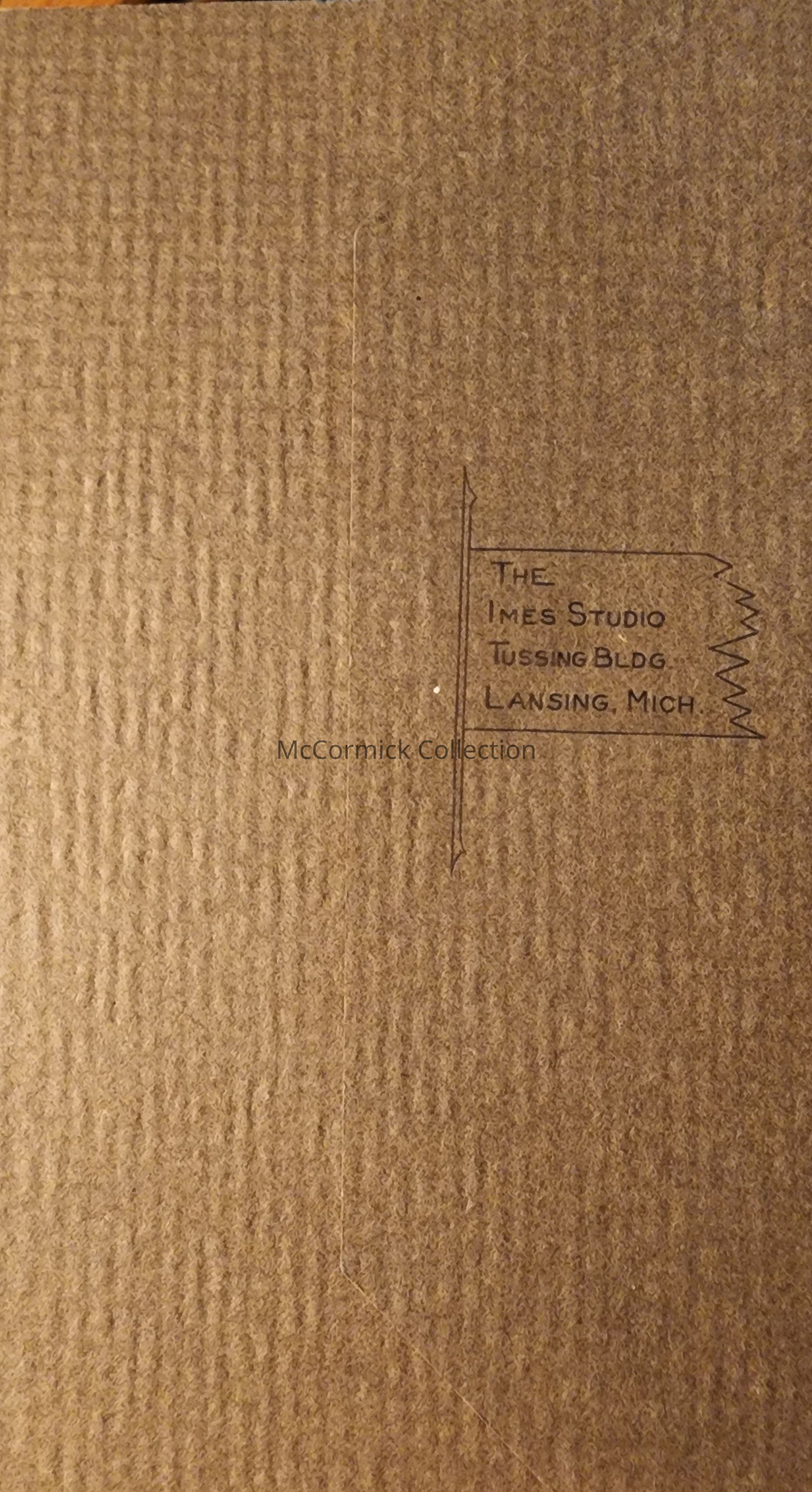 Folder frame mounted photograph of an unidentified child by Lansing photographer Imes. Imes Studio, Tussing Bldg, advertising on folder.