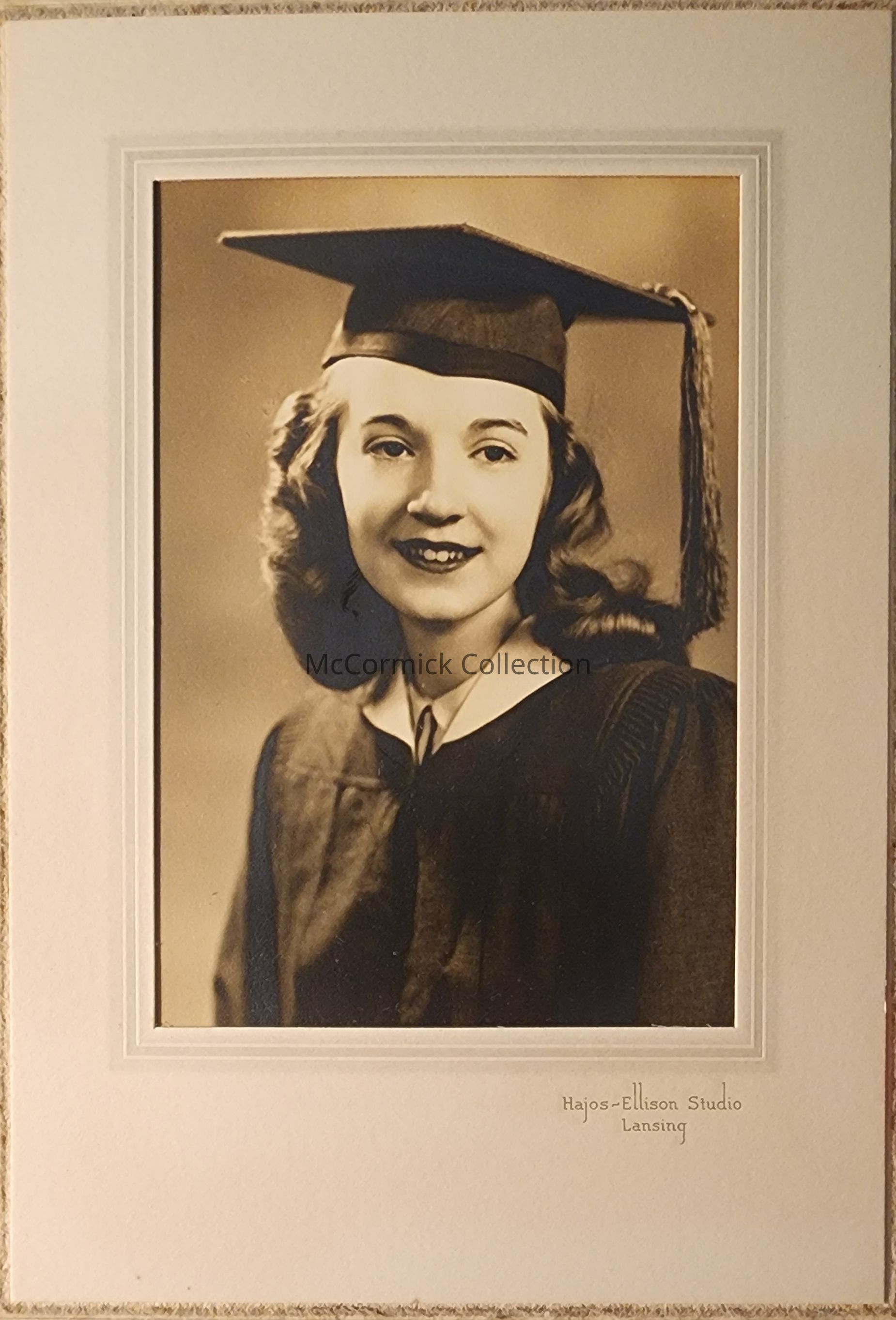 Folder frame mounted photograph of an unidentified female graduate by Lansing photographer Hajos-Ellison studio.