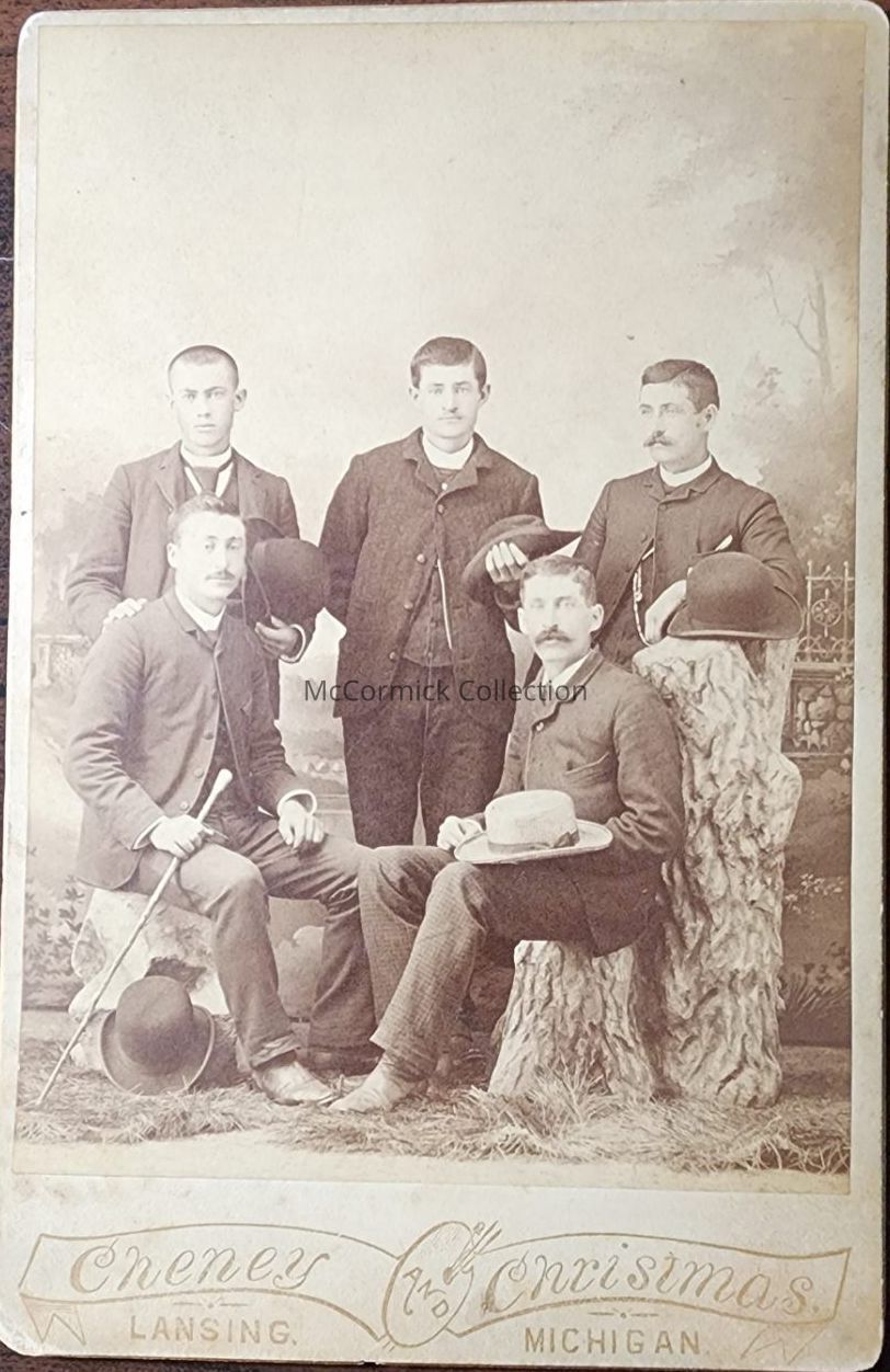 Cabinet card photograph of an unidentified group of five men holding hats by Lansing photographer Cheney and Christmas.