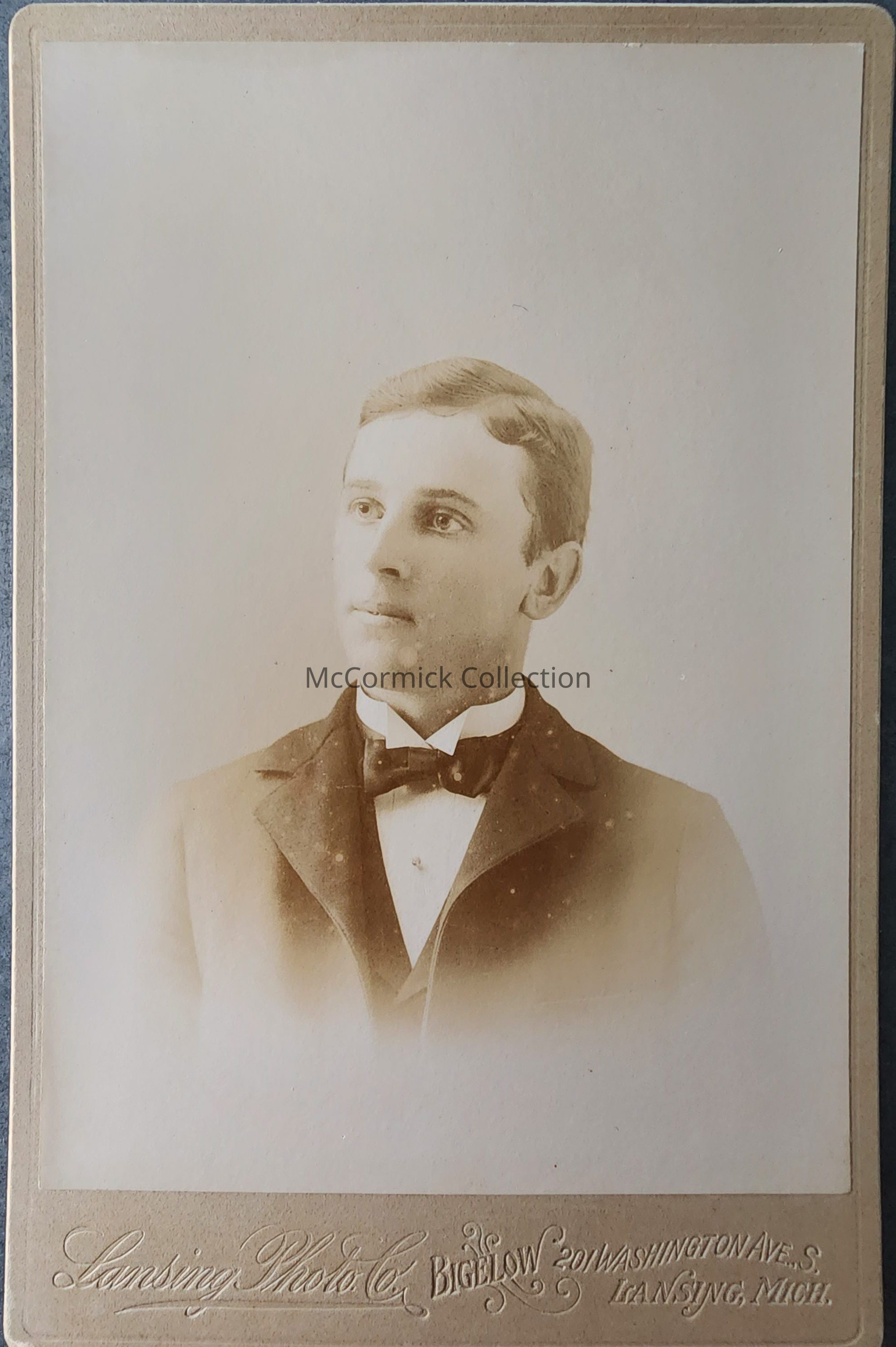 Cabinet card photographic portrait of an unknown man by Bigelow, Lansing photographer, circa 1893-95.
