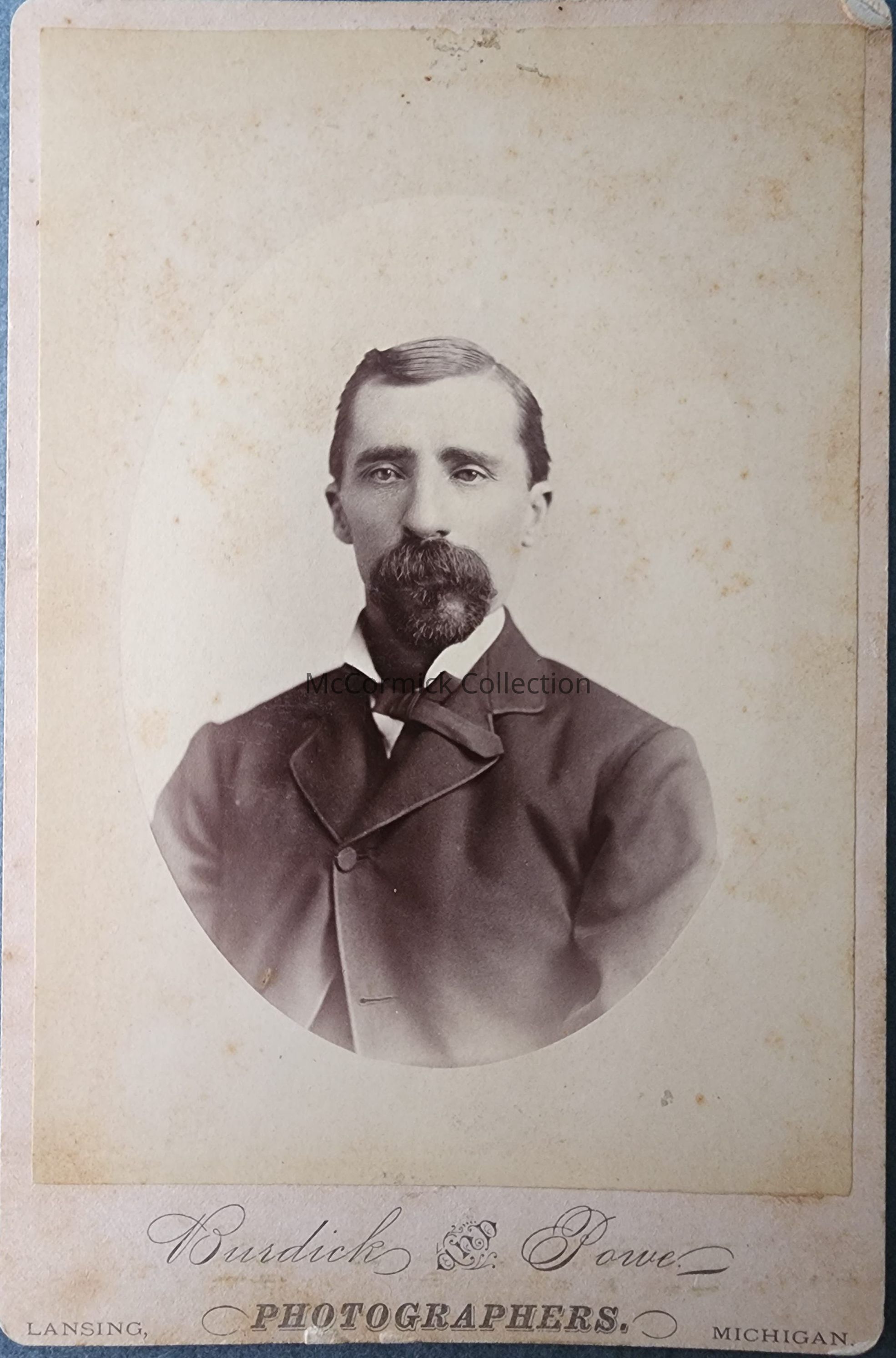 Cabinet card photograph of an unidentified man by Lansing photographer Burdick and Powe, circa 1880s.