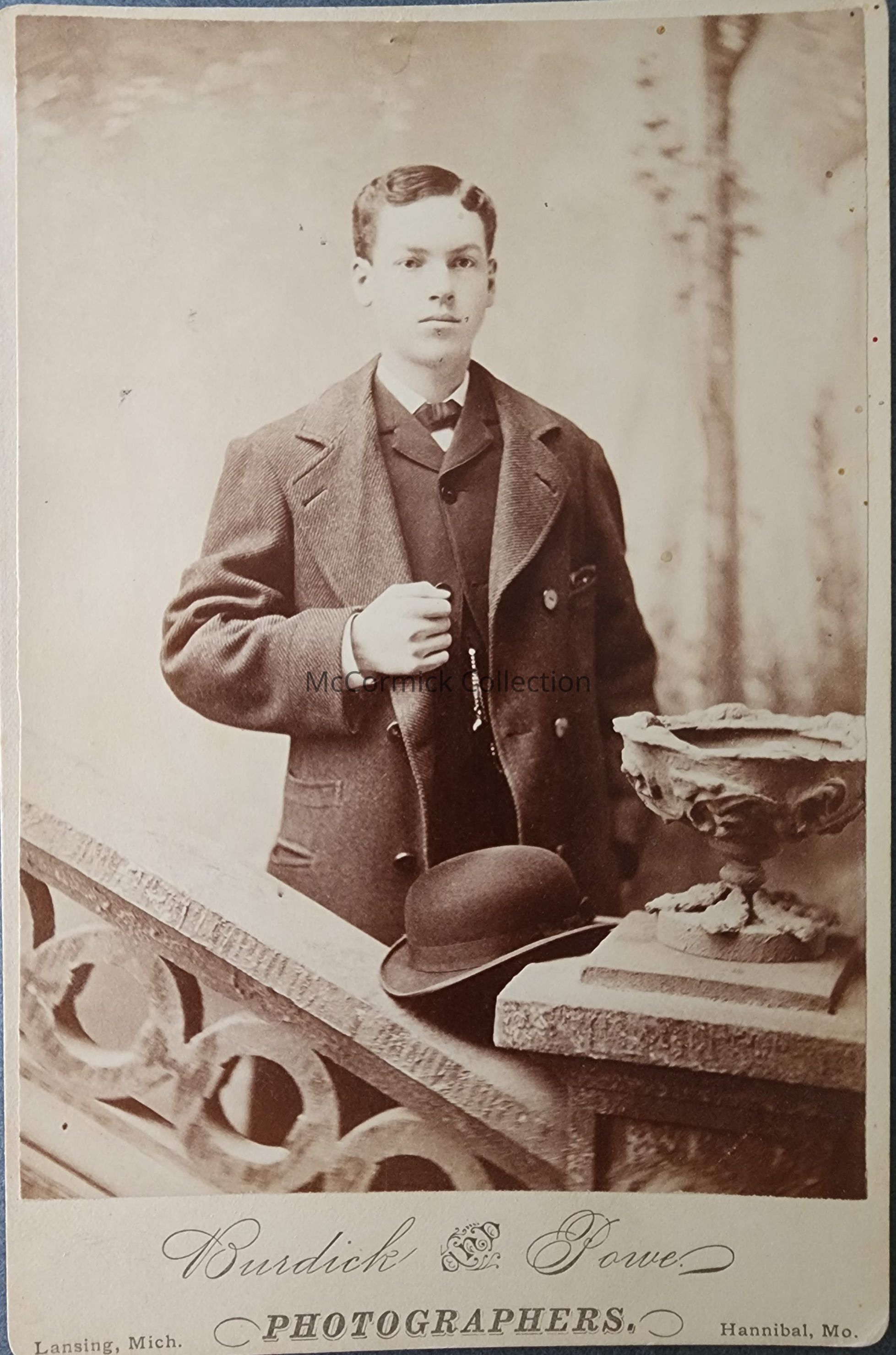 Cabinet card photograph of an unidentified man by Lansing photographer Burdick and Powe, circa 1880d.