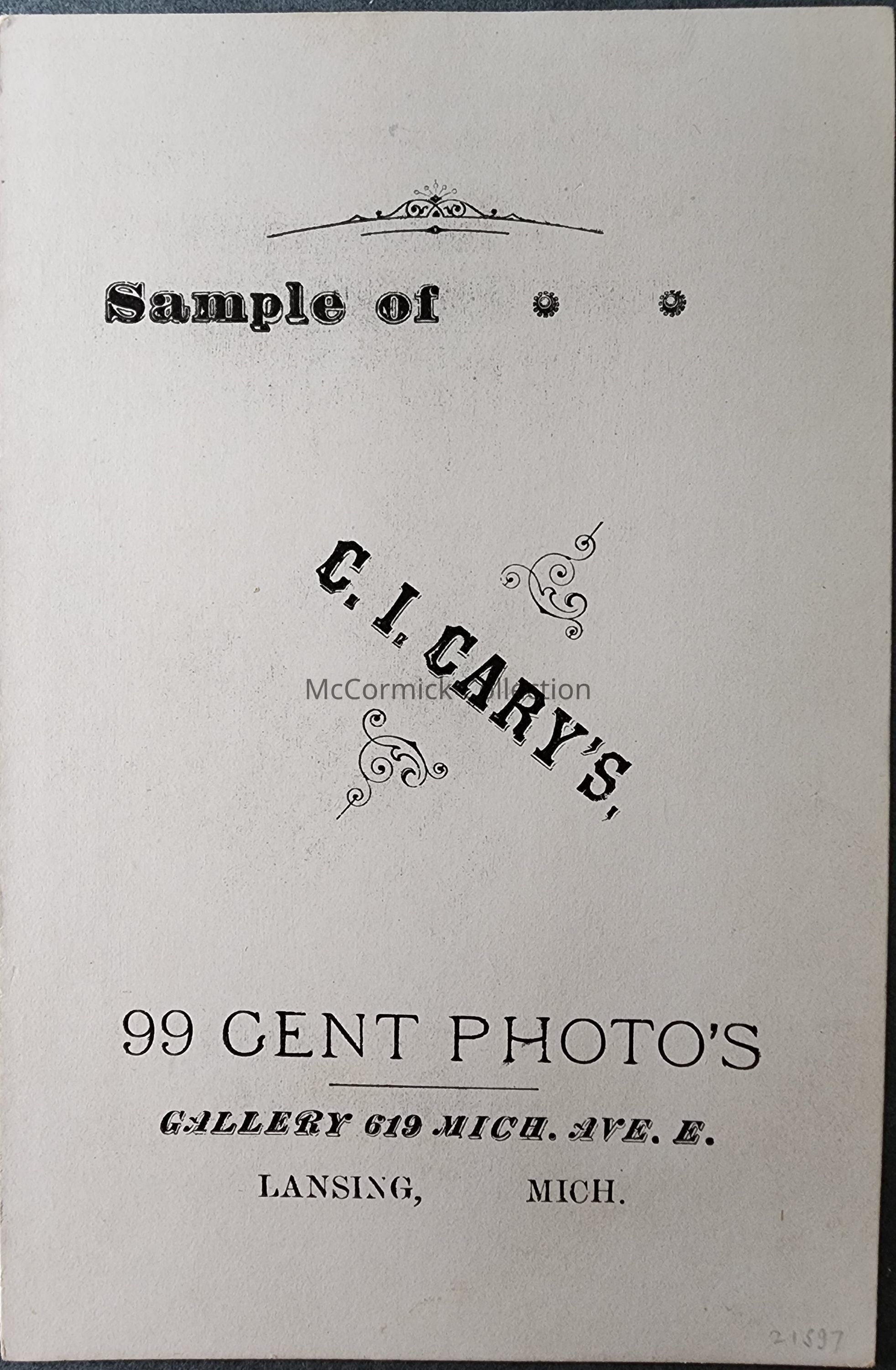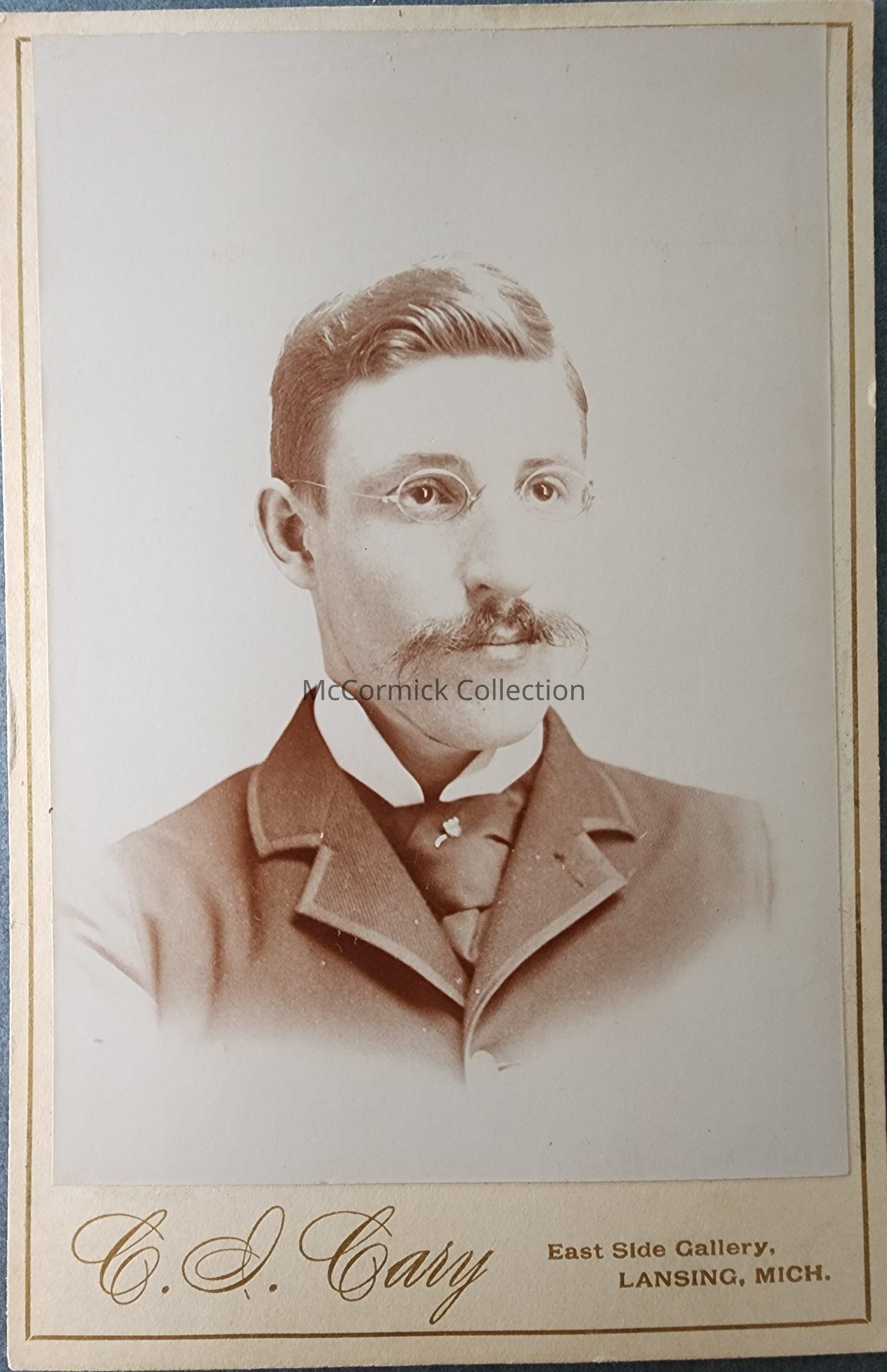Cabinet card photograph of an unidentified man by Lansing photographer C.I. Cary, East Sife Gallery, circa 1893.