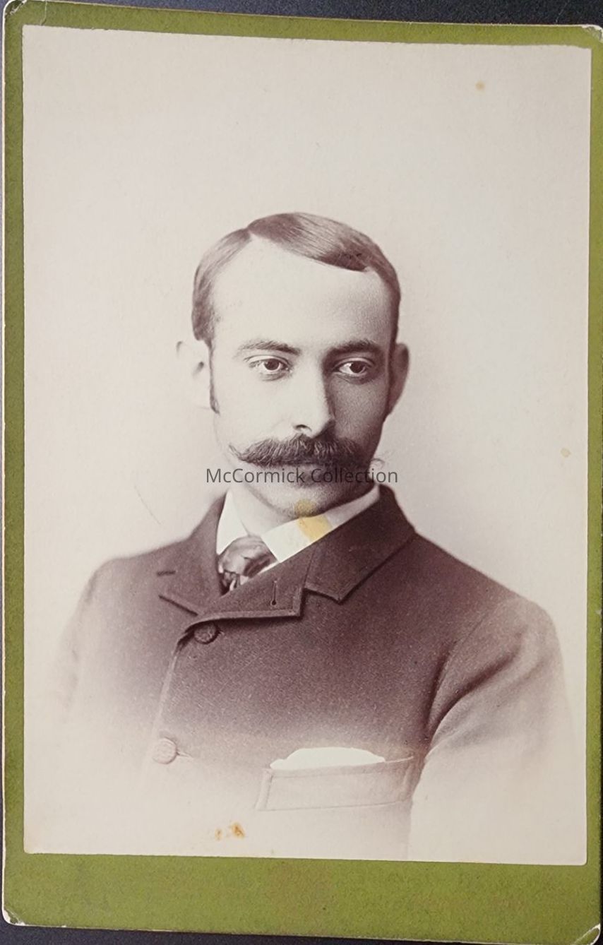 Cabinet card photograph of an unidentified man by Lansing photographer Cassey and Whitney. Associated with Michigan Agricultural College.