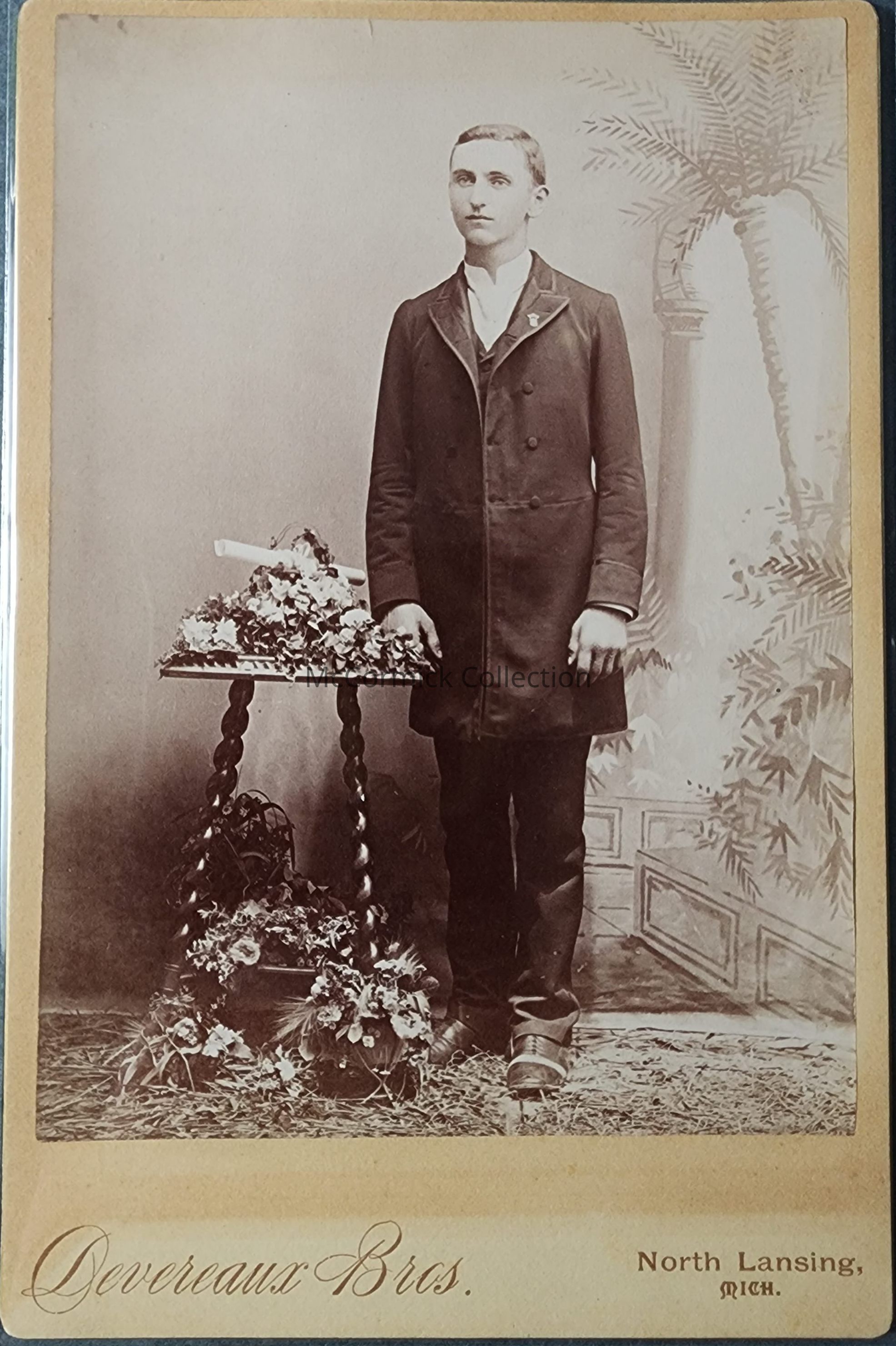 Cabinet card photograph of an unidentified man by North Lansing photographer Devereaux Bros., .