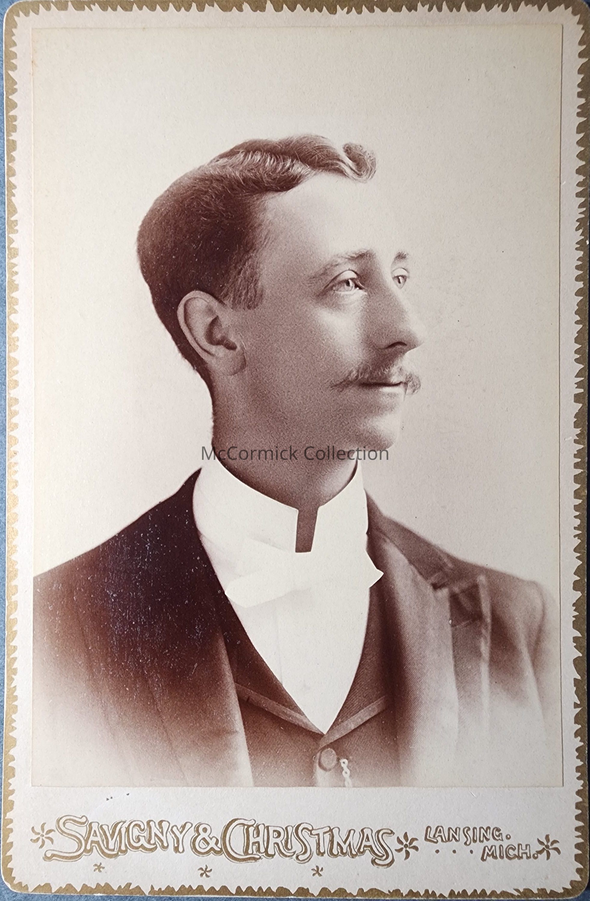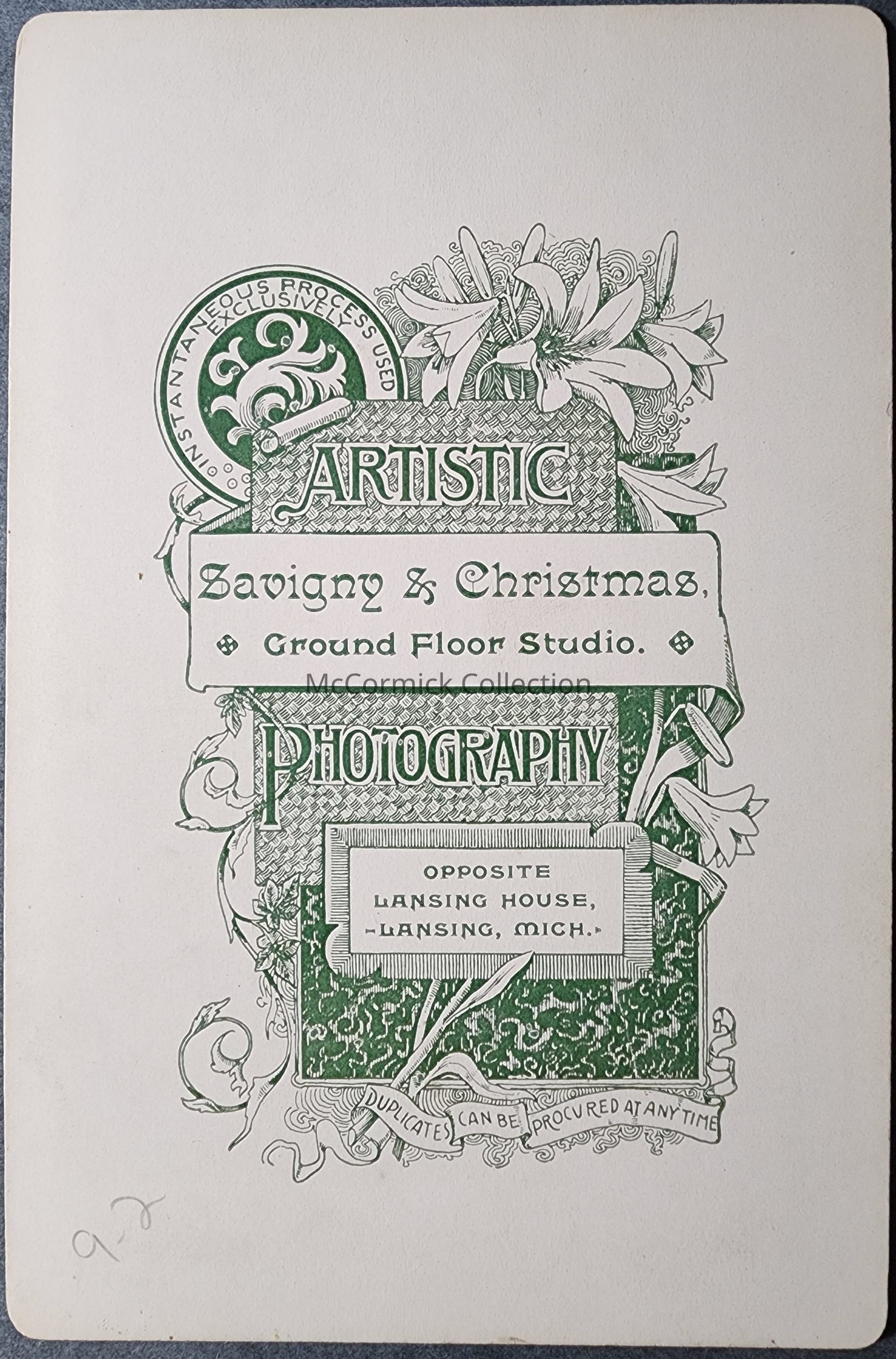 Cabinet card photograph of an unidentified man by Lansing photographer Savigny and Christmas.