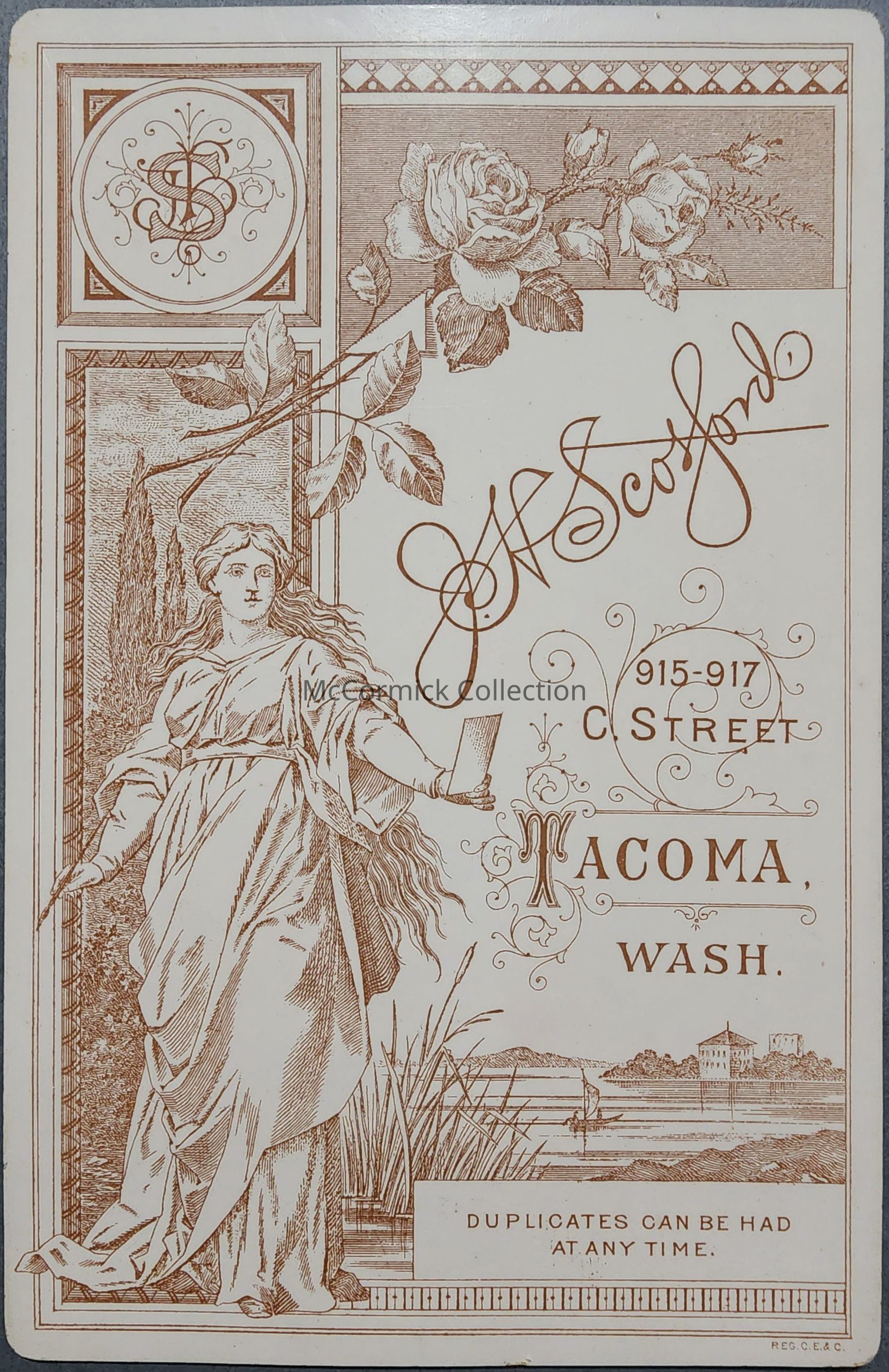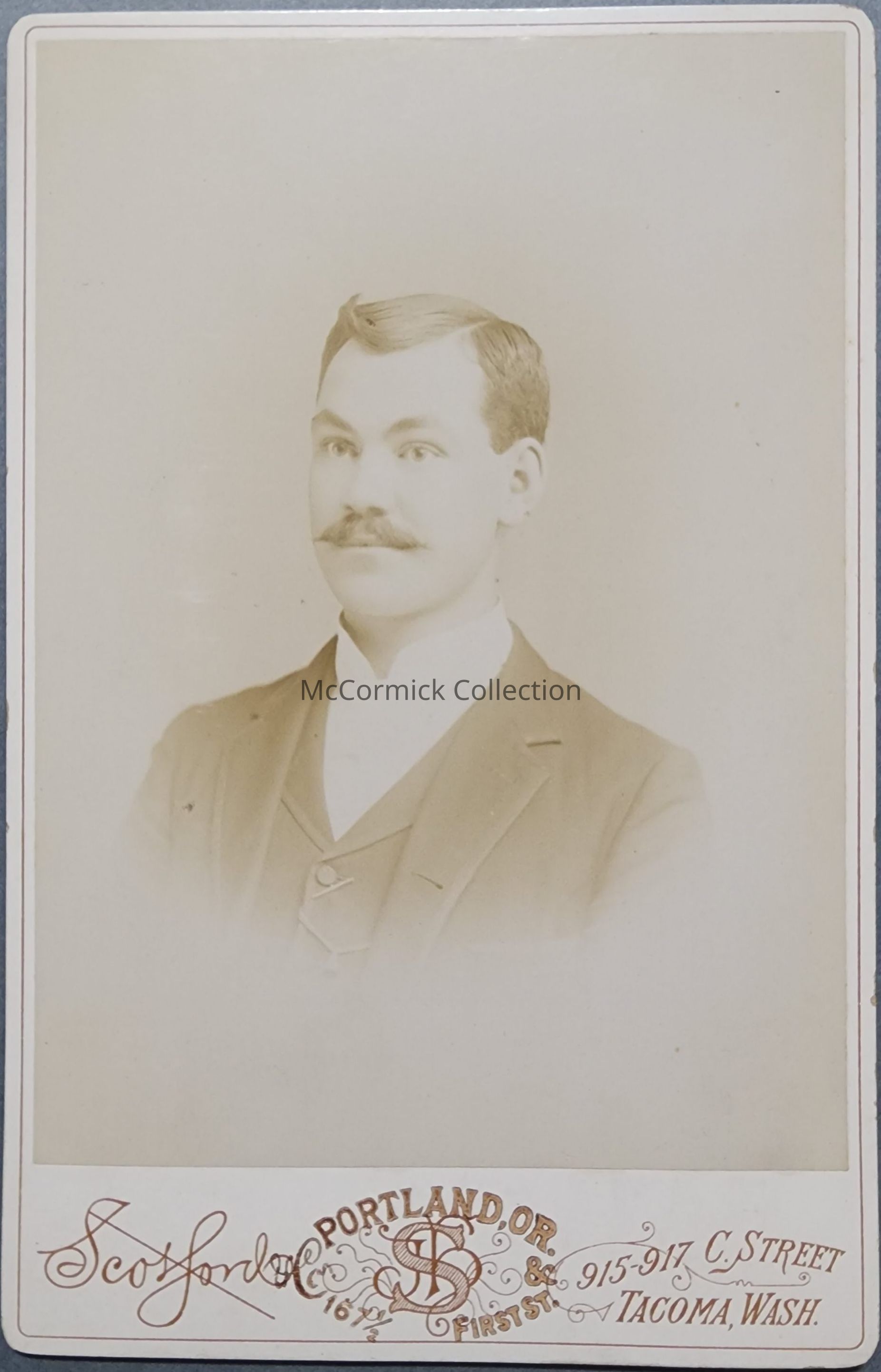 Cabinet card photograph of an unknown man by John Harvey Scotford, Lansing photographer here later working in Porland, OR. The mount lists both Portland and Tacoma, WA. Circa 1890s.Made/Created
