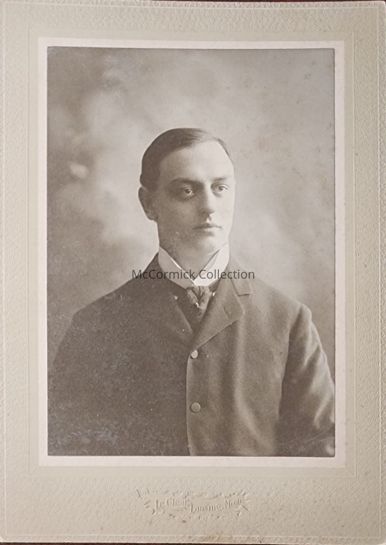 Card mounted photograph of an unidentified man by Lansing photographer LeClear. Likely tied to Michigan Agricultural College, circa 1898. From O.W. Slayton Collection.