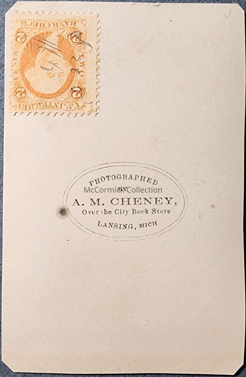 Carte de visite photograph of an unidentified man by Lansing photographer Cheney. Has orange 2-cent revenue stamp.