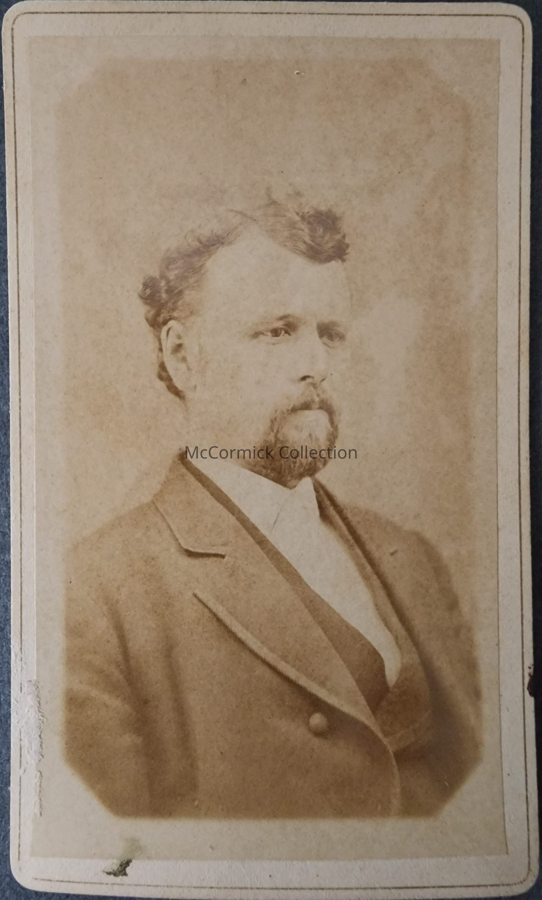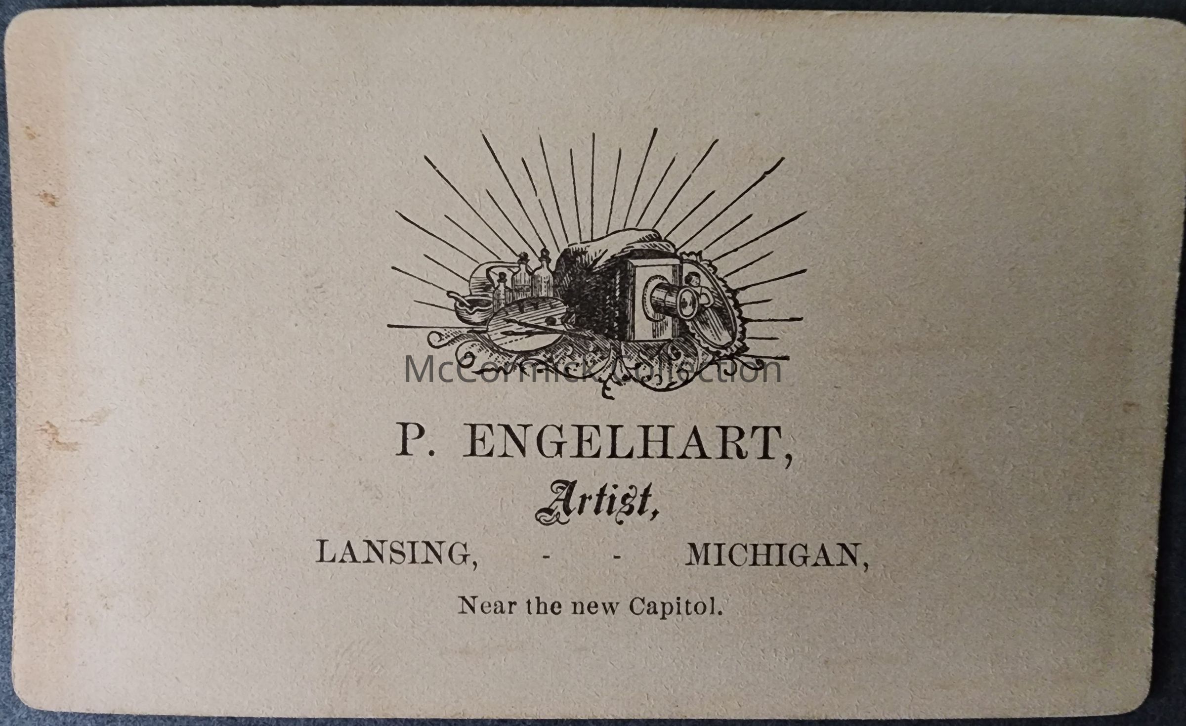 Carte de visite photograph of an unidentified man by Lansing photographer Engelhart, circa 1864-1876. Imprint reads: Near the new Capitol.