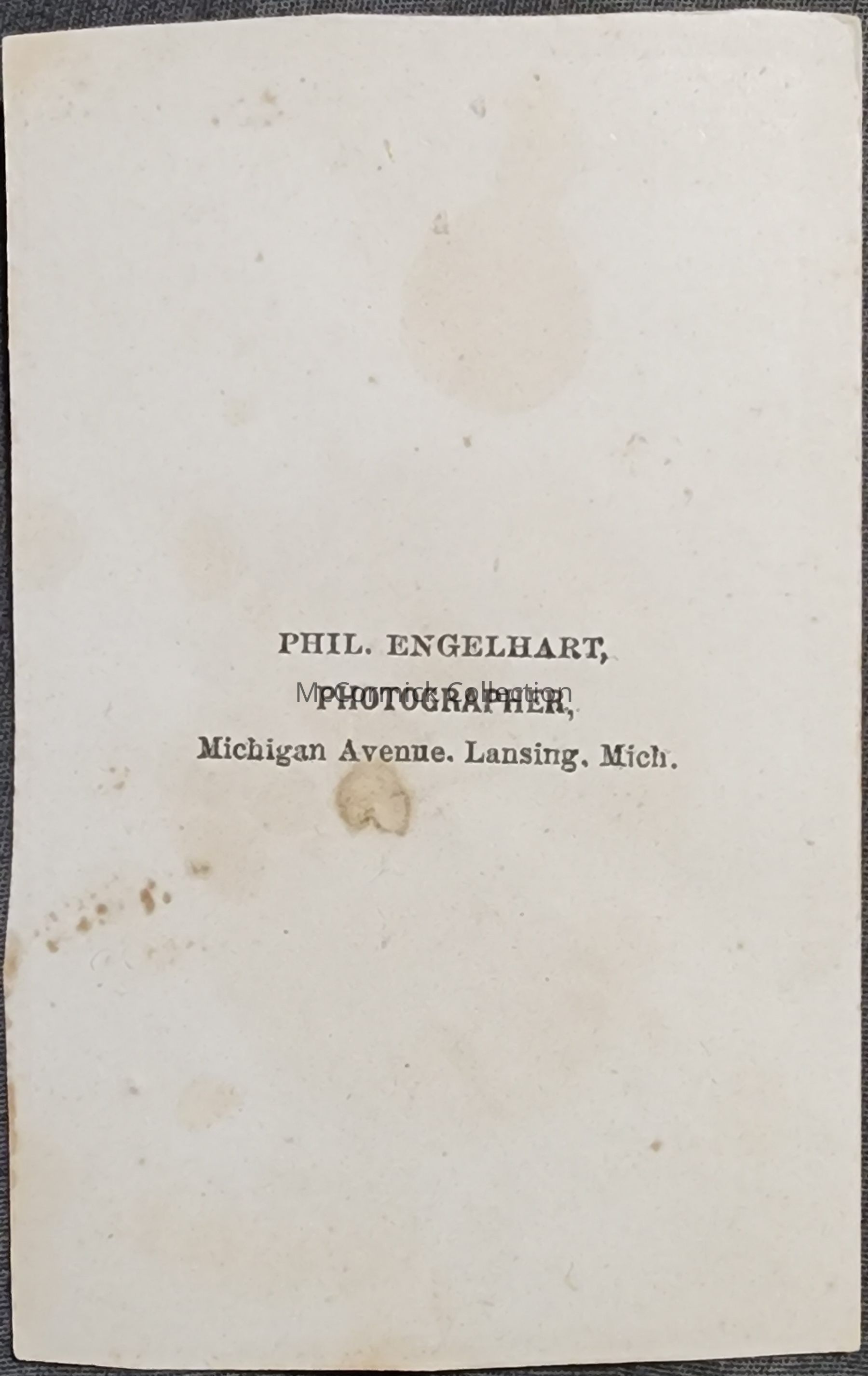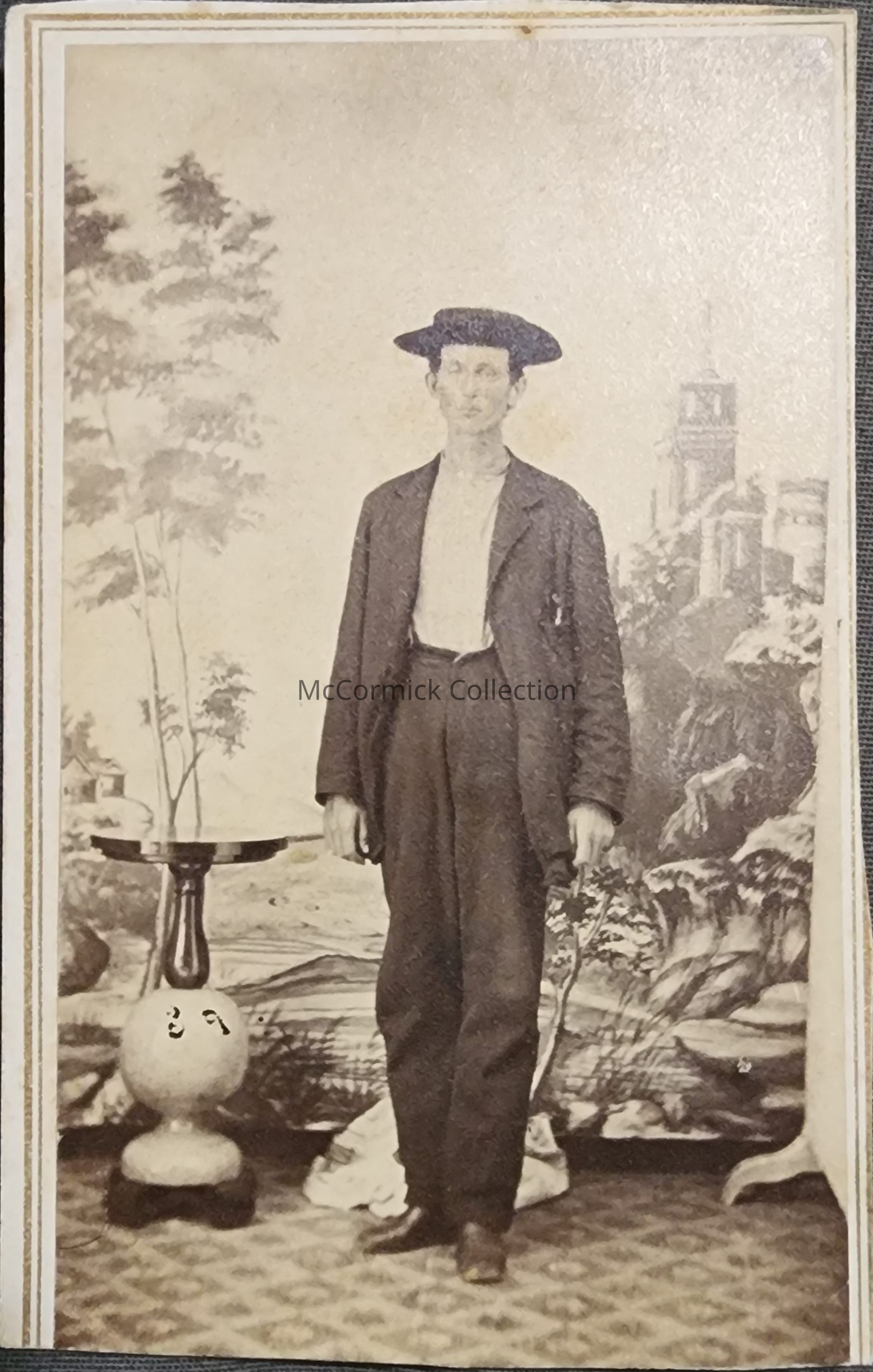 Carte de visite photograph of an unidentified man with an elaborate backdrop and props taken by Lansing photographer Philip Engelhart. The number 29 is written on a prop.