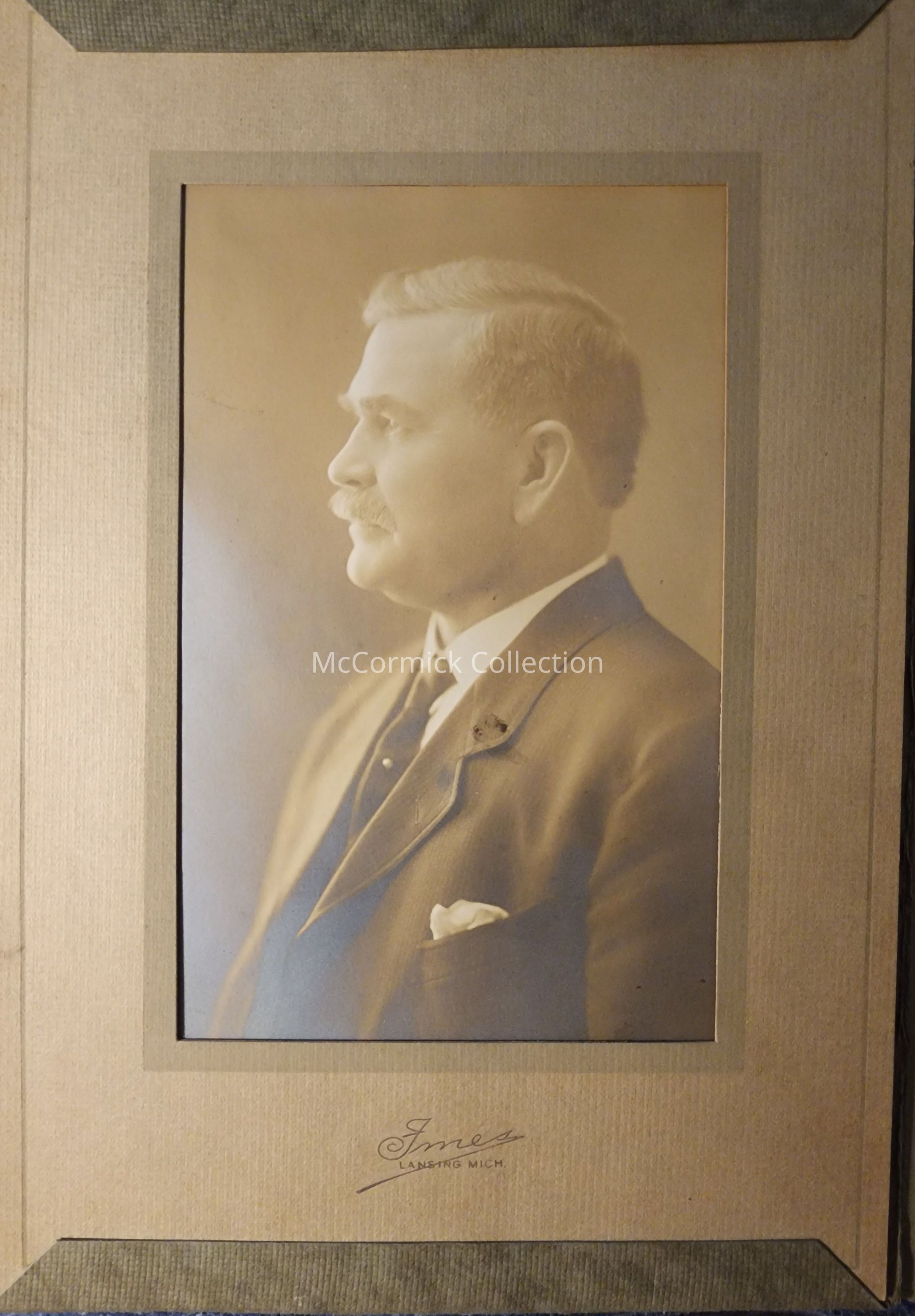 Folder frame mounted photograph of an unidentified man by Lansing photographer Imes. From the Chase Collection.