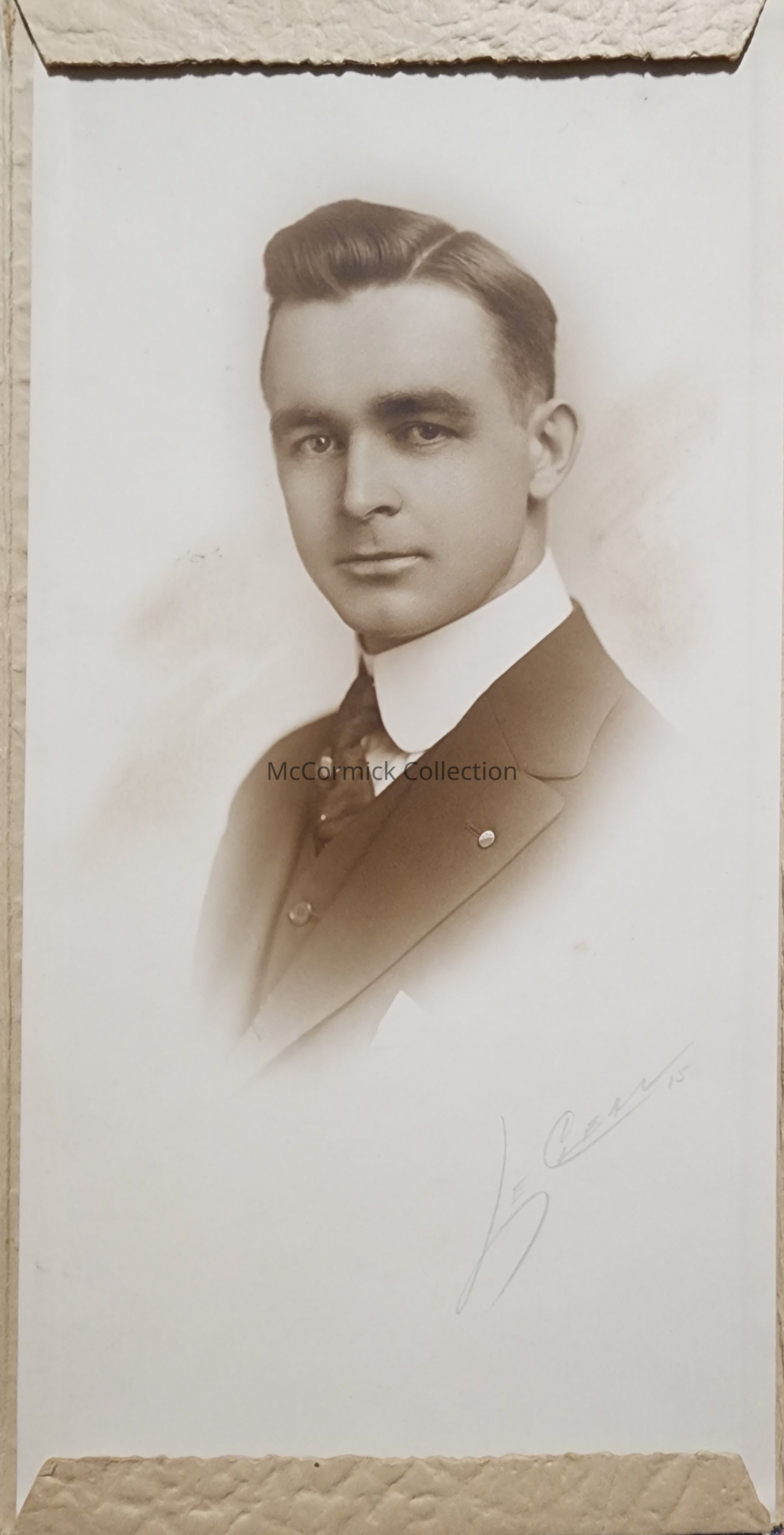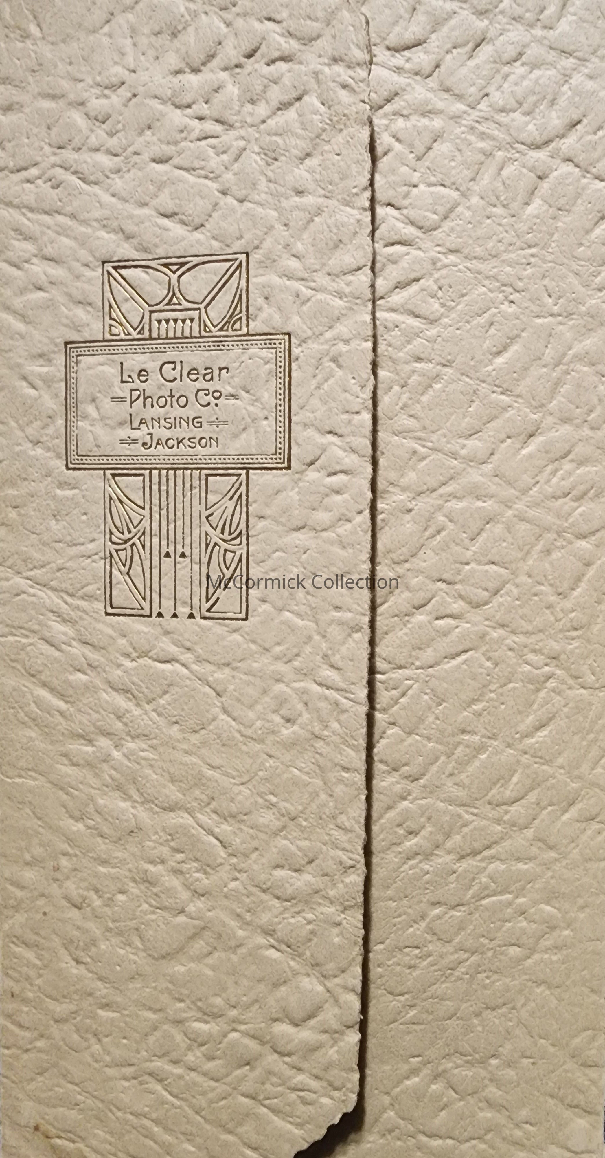 Folder frame mounted photograph of an unidentified man by Lansing photographer LeClear. Dated 1915.