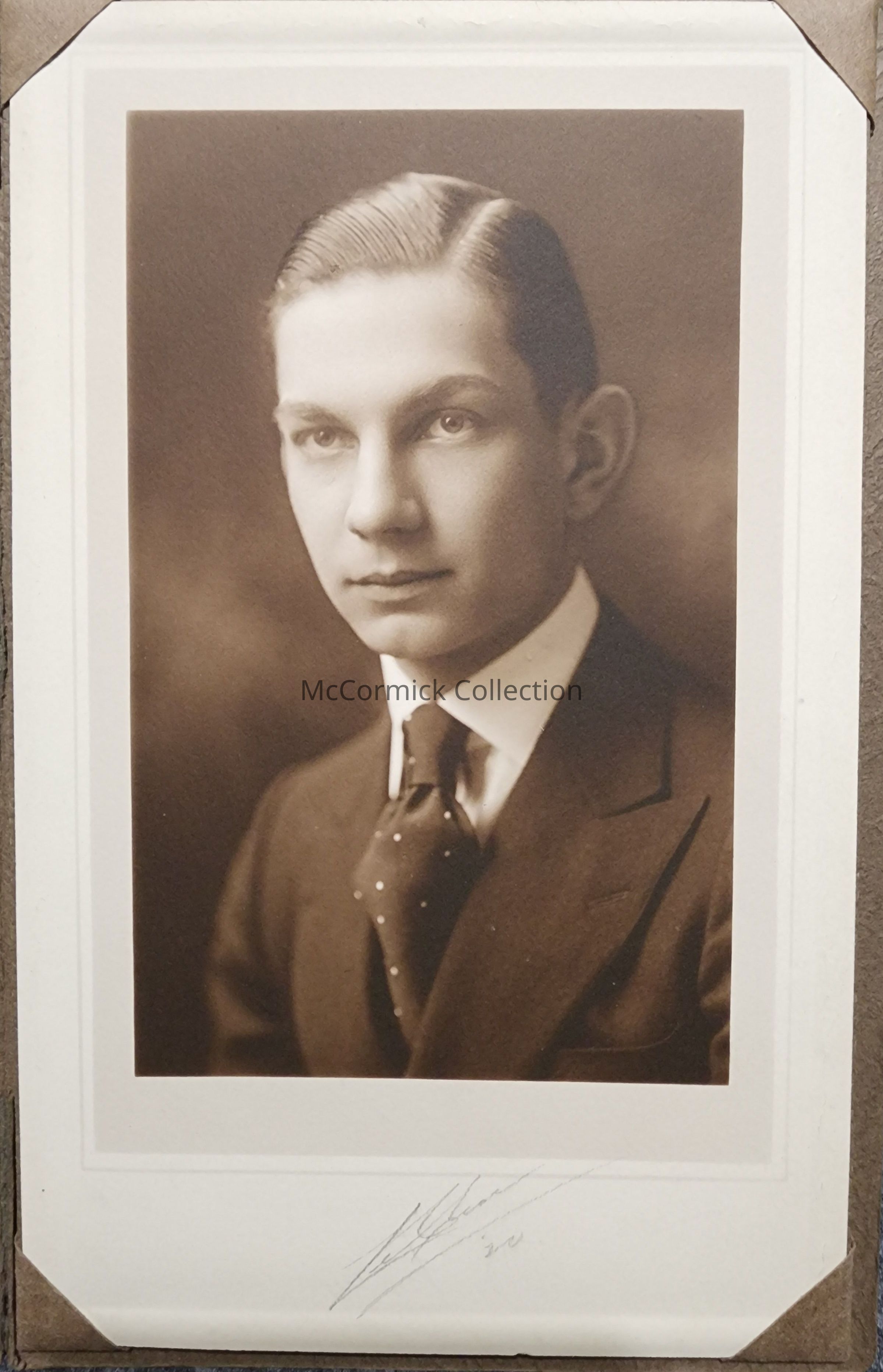 Folder frame mounted photograph of an unidentified man by Lansing photographer LeClear. Dated 1920.