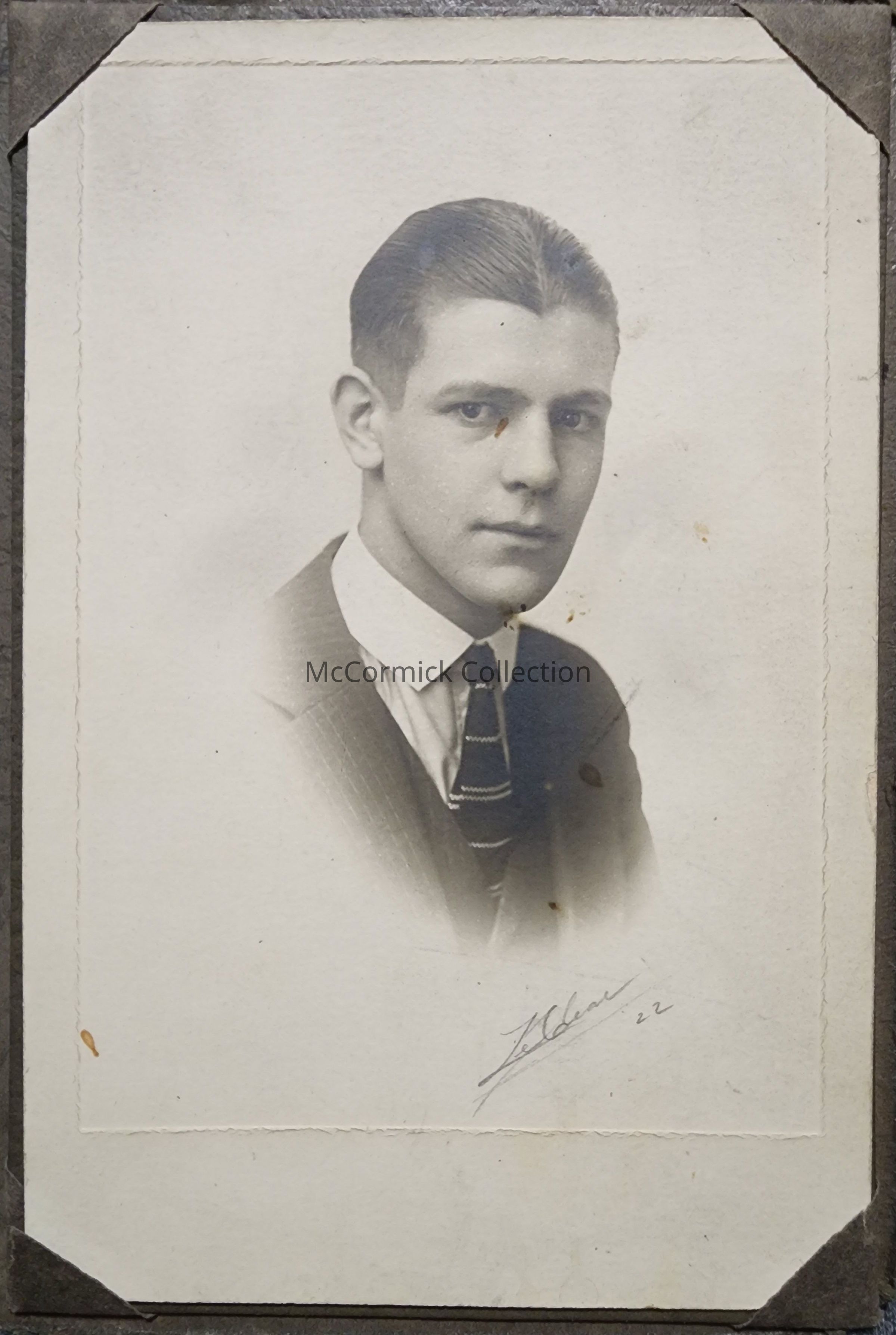Folder frame mounted photograph of an unidentified man by Lansing photographer LeClear. Dated 1922.