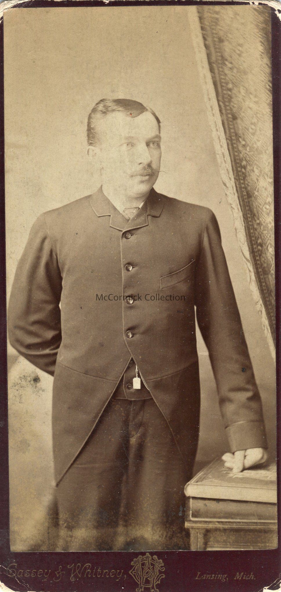 Cassey & Whitney portrait photograph, circa 1884-1887. While standard size cabinet cards by this studio are common, this portrait photograph is about 2 inches taller than a standard cabinet card. This card is the only image by a Lansing photographer that I have located in this size. This format allows for closer full-body shots, most often used for photographs of women wearing large elaborate dresses.