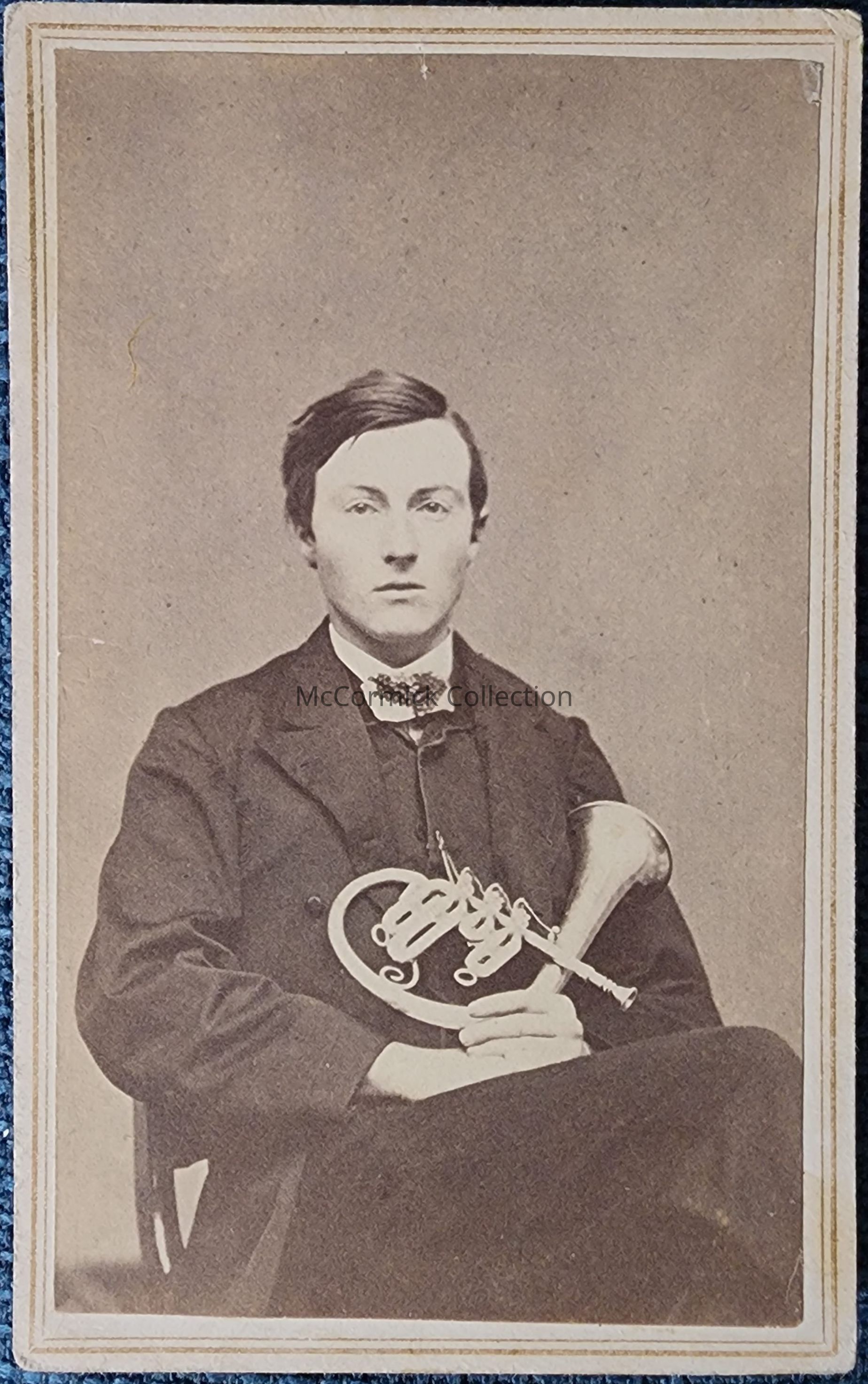 Portrait photograph of an unidentified man holding a brass instrument. Another photo of this man was taken by Hall in Lansing, circa 1860s. Gift of Eric Satterlee.