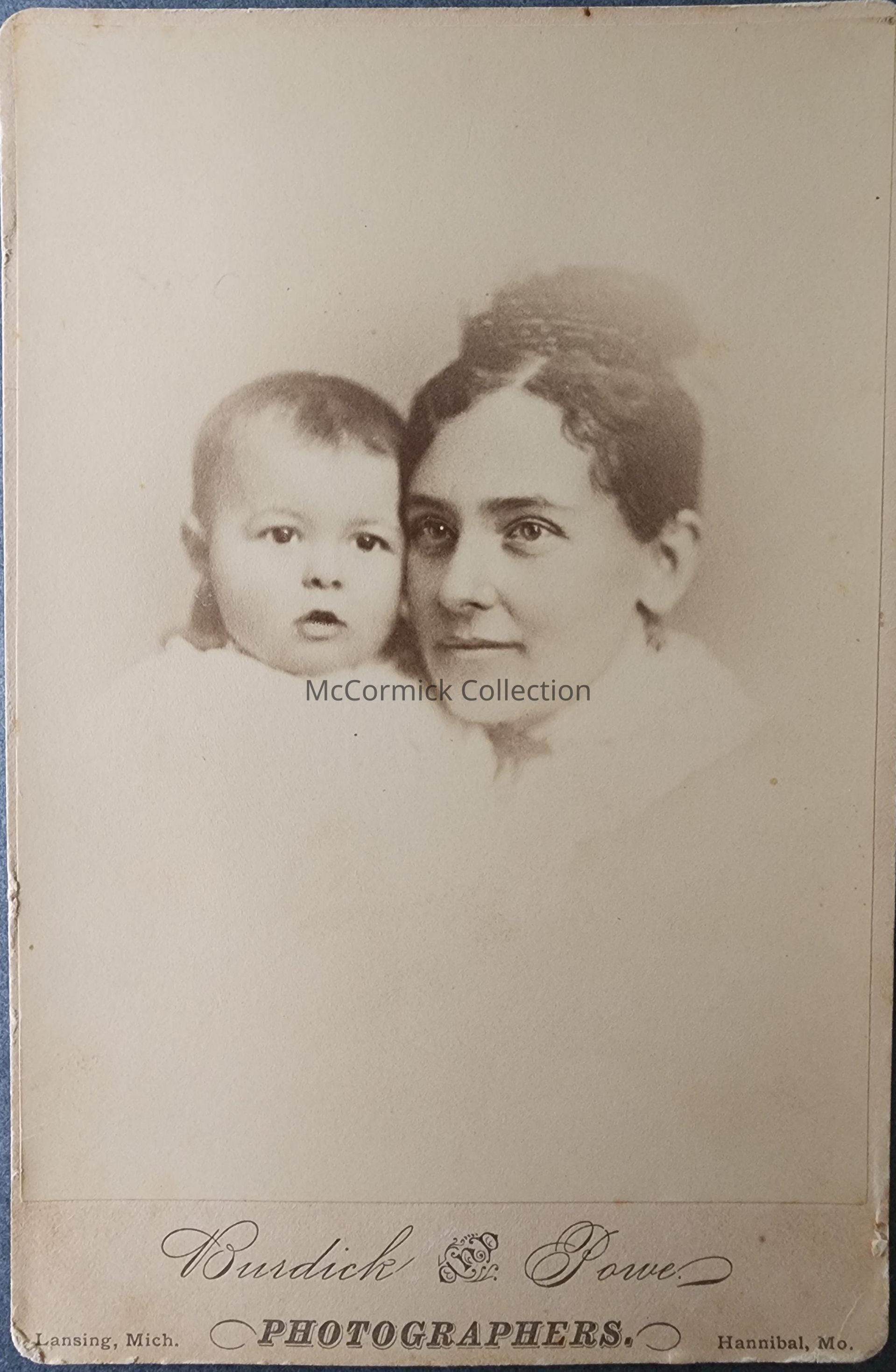 Cabinet card photograph of an unidentified mother and child taken by Lansing photographer Burdick and Powe, circa 1880-83.