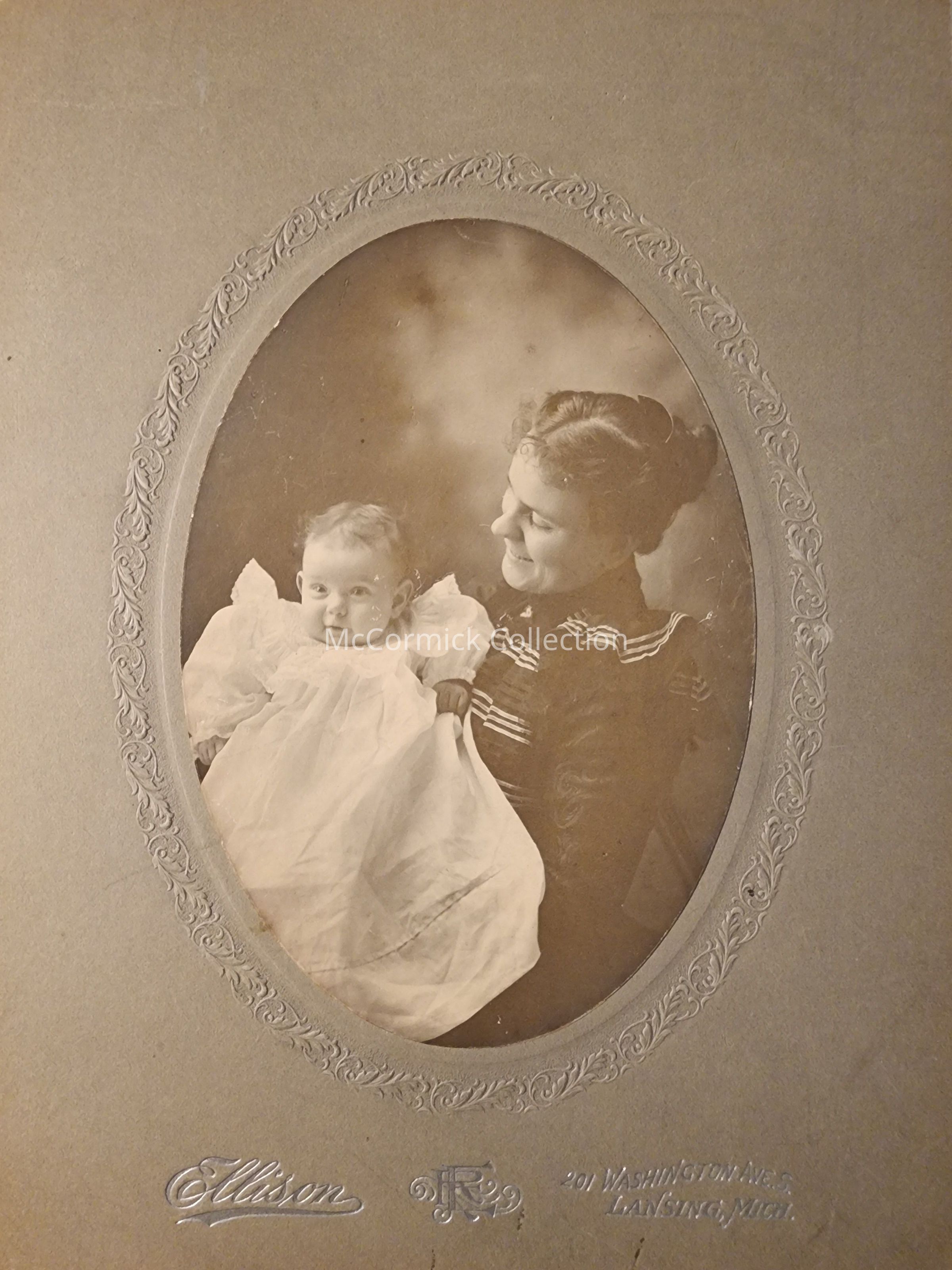 Card mounted photograph of an unidentified woman and child by Lansing photographer Ellison.