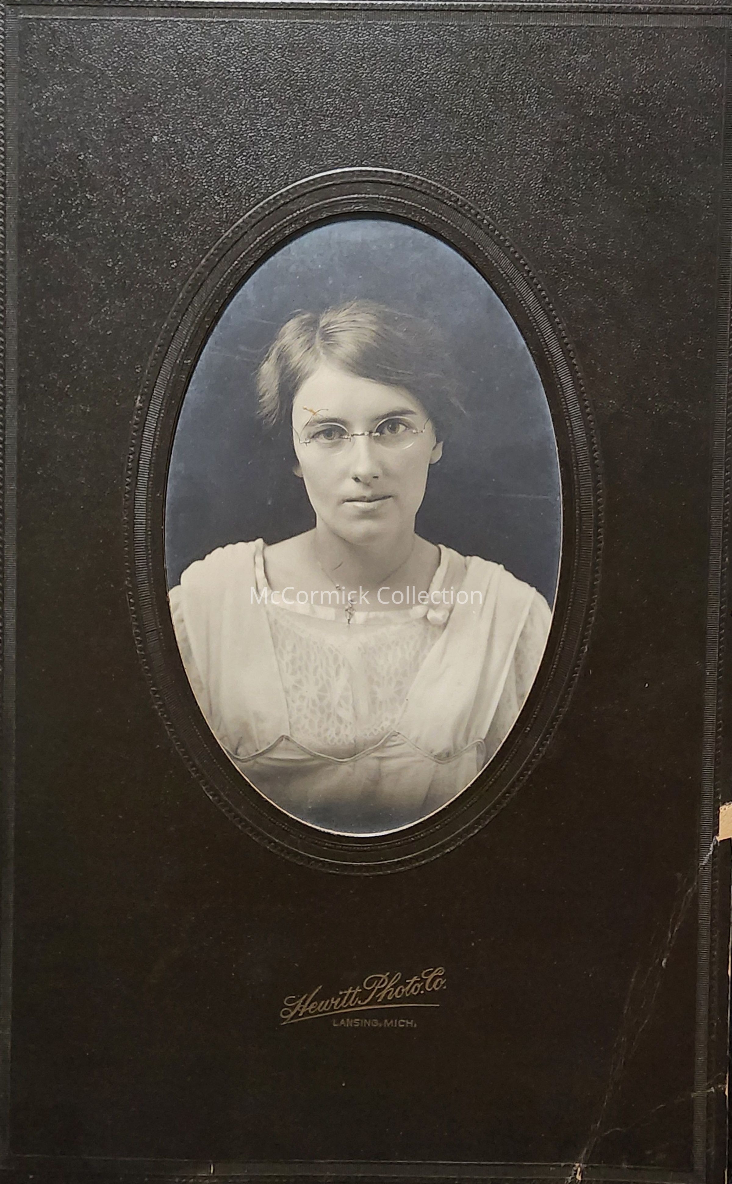 Folder frame mounted photograph of an unidentified woman by Lansing photographer Hewitt Photo Co.