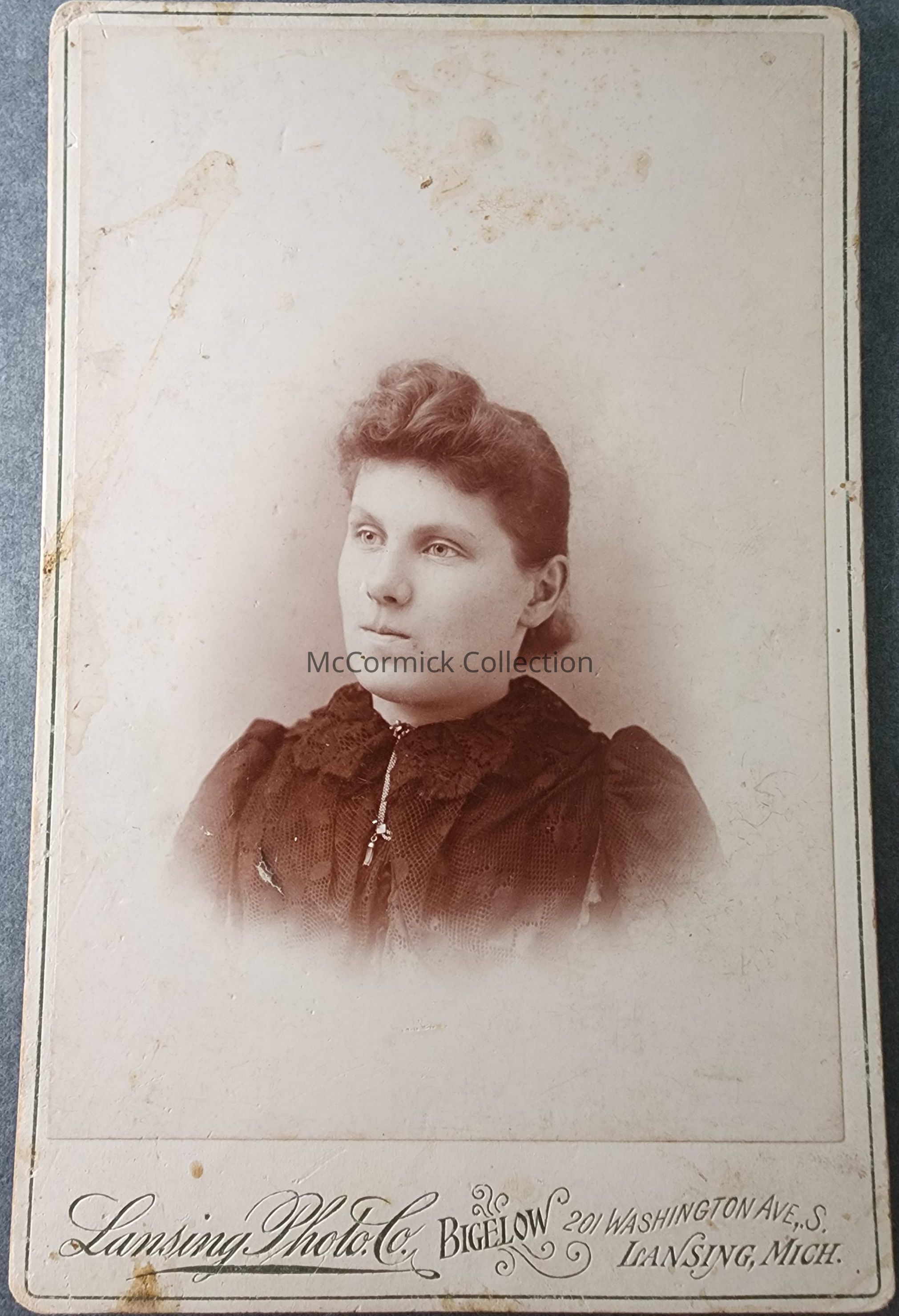 Cabinet card photograph of an unidentified woman by Bigelow, Lansing photographer. Circa 1893-95.