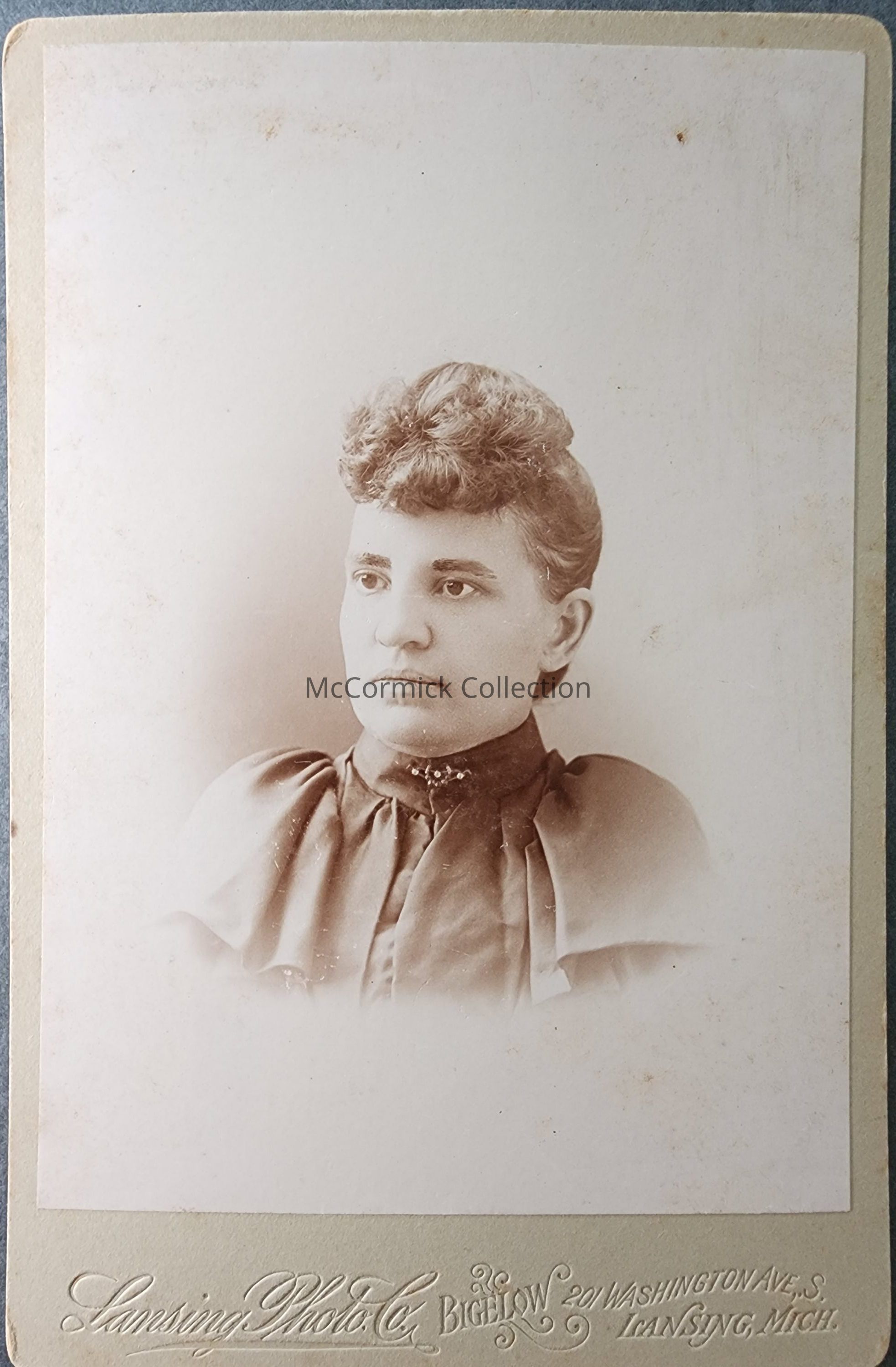 Cabinet card photograph of an unidentified woman by Lansing photographer Bigelow, circa 1893-95.