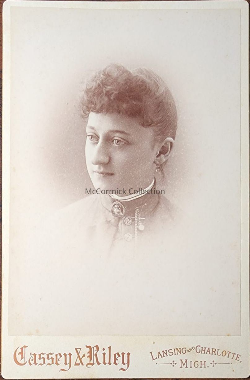 Cabinet card photograph of an unidentified woman by Lansing photographer Cassey and Riley.