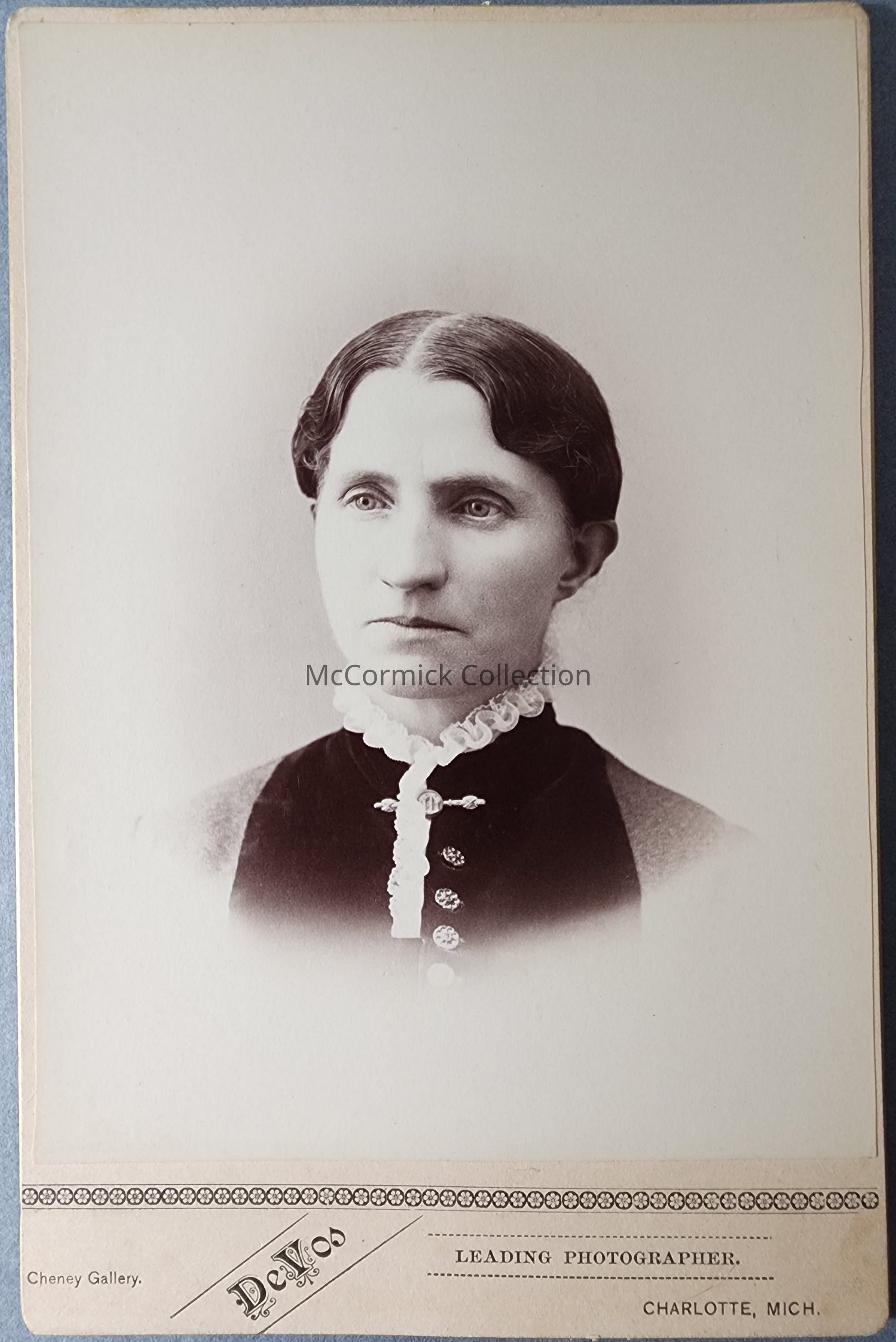 Cabinet card photograph of an unidentified woman by DeVos of Charlotte in the Cheney Gallery. Cheney worked in Lansing.