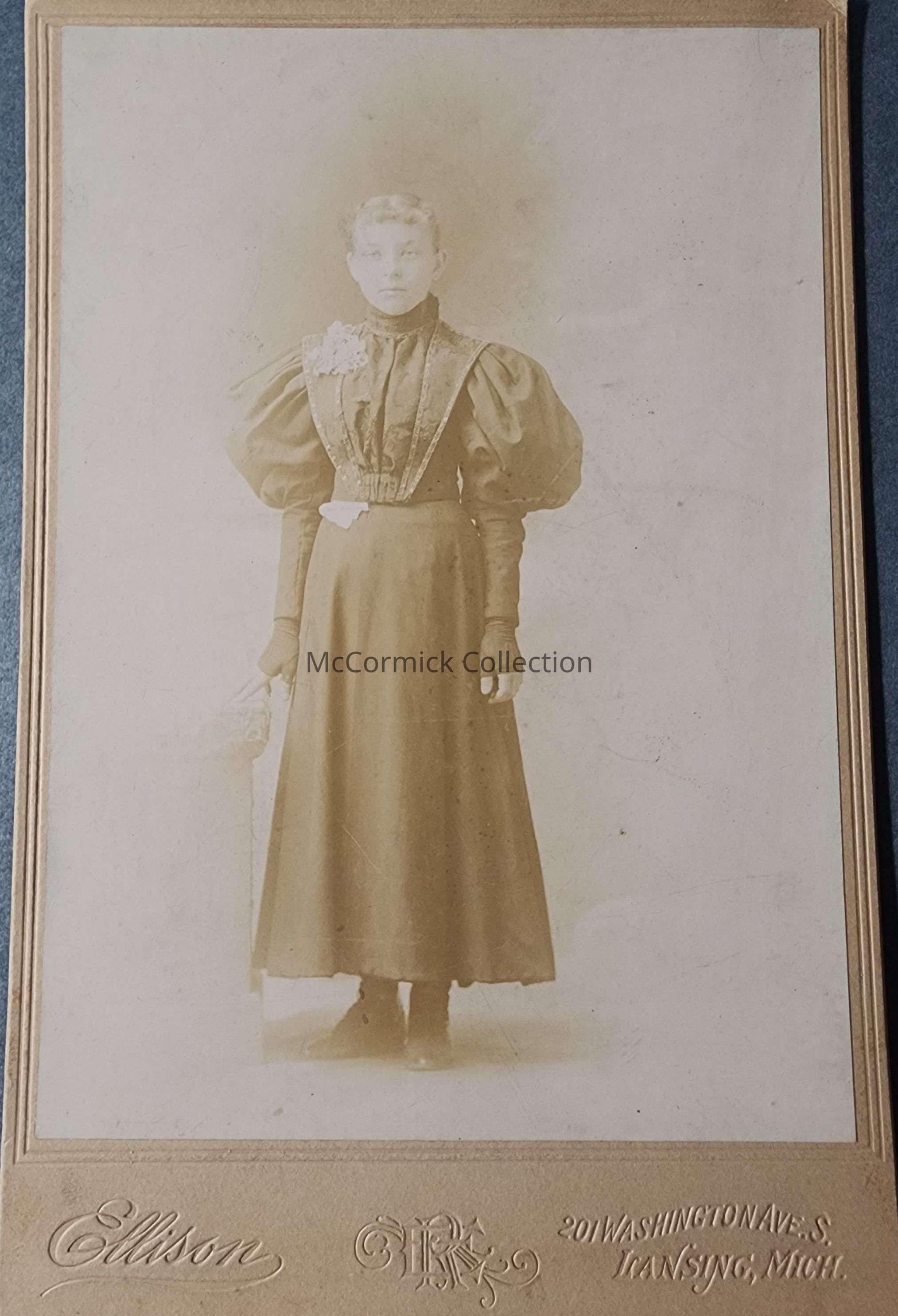 Cabinet card photograph of an unidentified woman by Lansing photographer Ellison, circa 1890s.