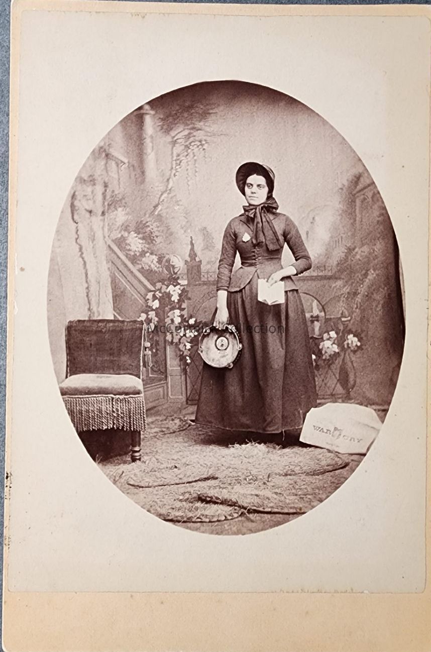 Cabinet card photograph of an unidentified woman by North Lansing photographer Heath. She is holding a book and tambourine. A paper titled "War Cry" is on the floor next to her. Circa .