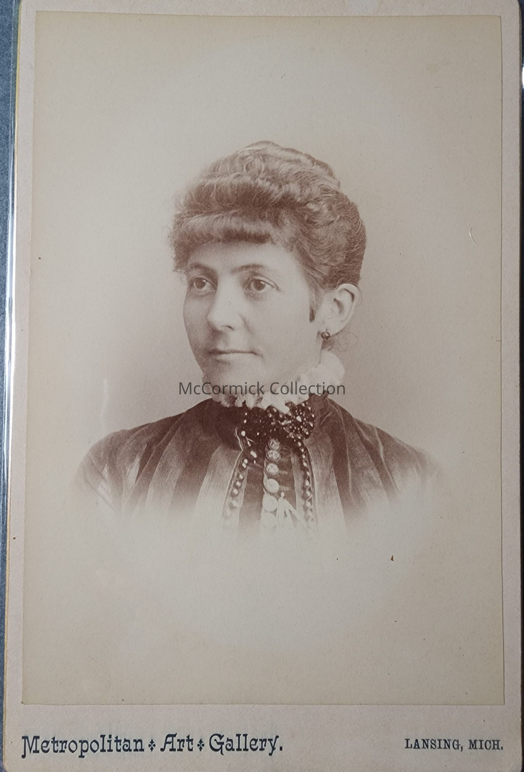 Cabinet card photograph of an unidentified woman by Lansing photographer Metropolitan Art Gallery.