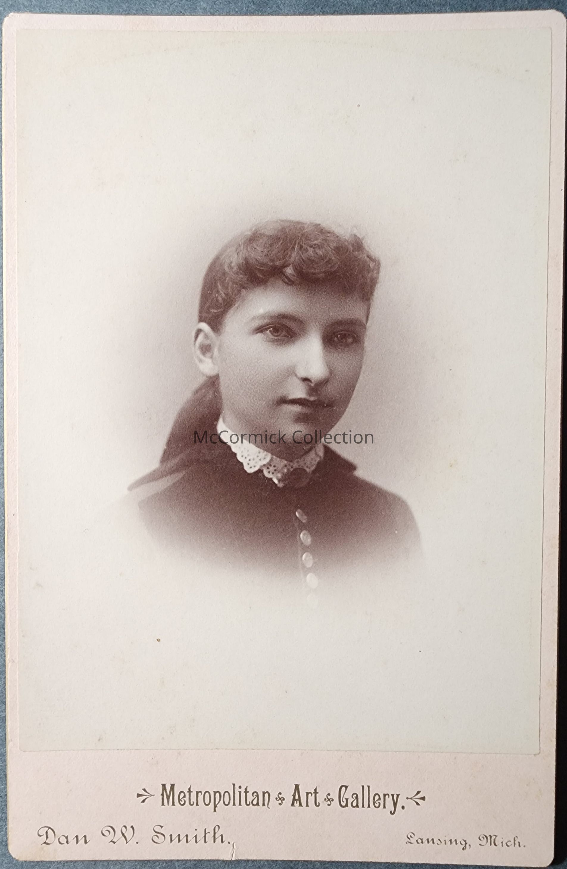 Cabinet card photograph of an unidentified woman, possibly an MAC student, by Lansing photographer Metropolitan Art Gallery, Dan W. Smith.Made/Created