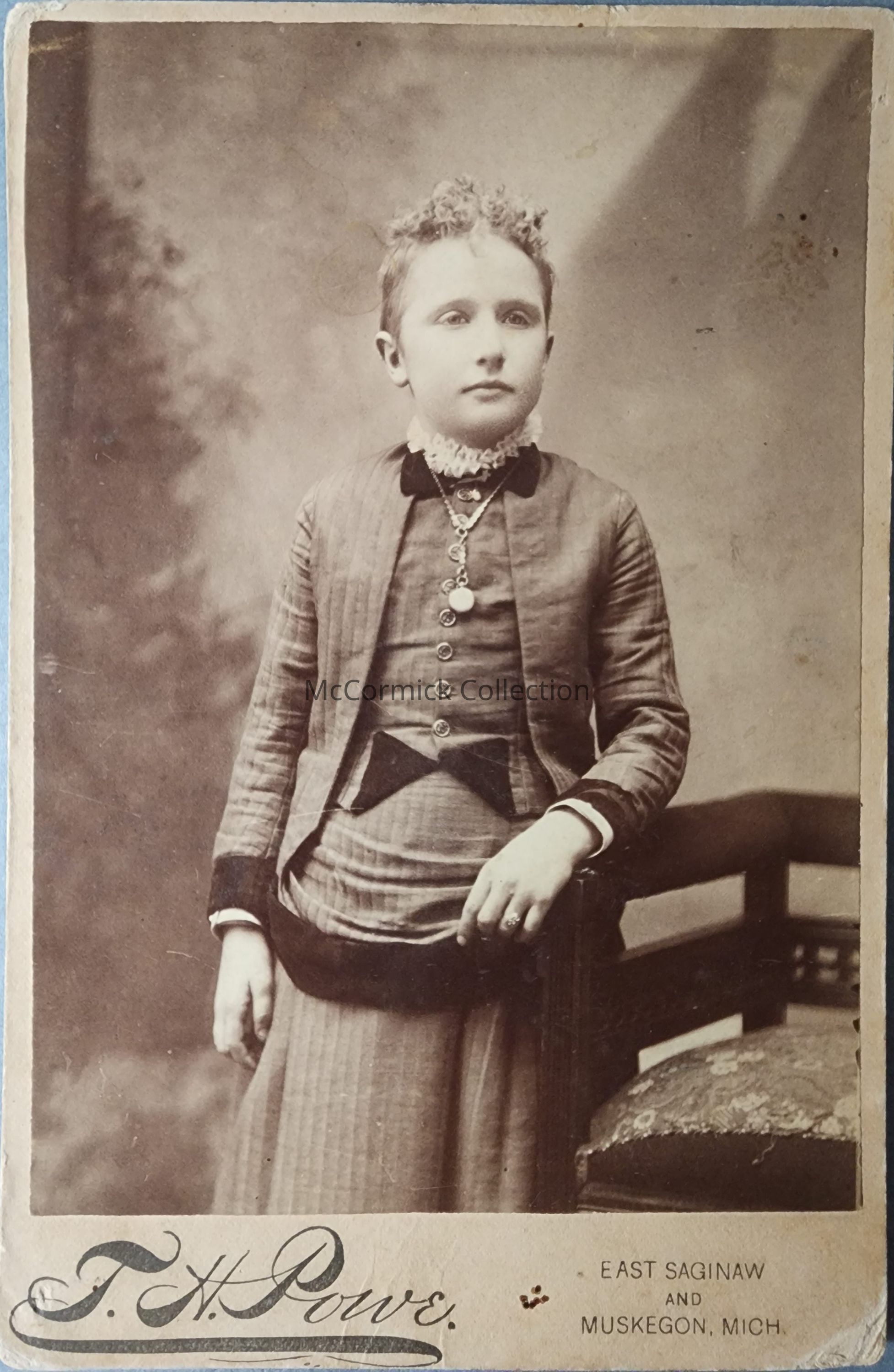 Cabinet card photograph of an unidentified child by T. Harland Powe of East Saginaw and Muskegon. Powe also worked in Burdick in Lansing.