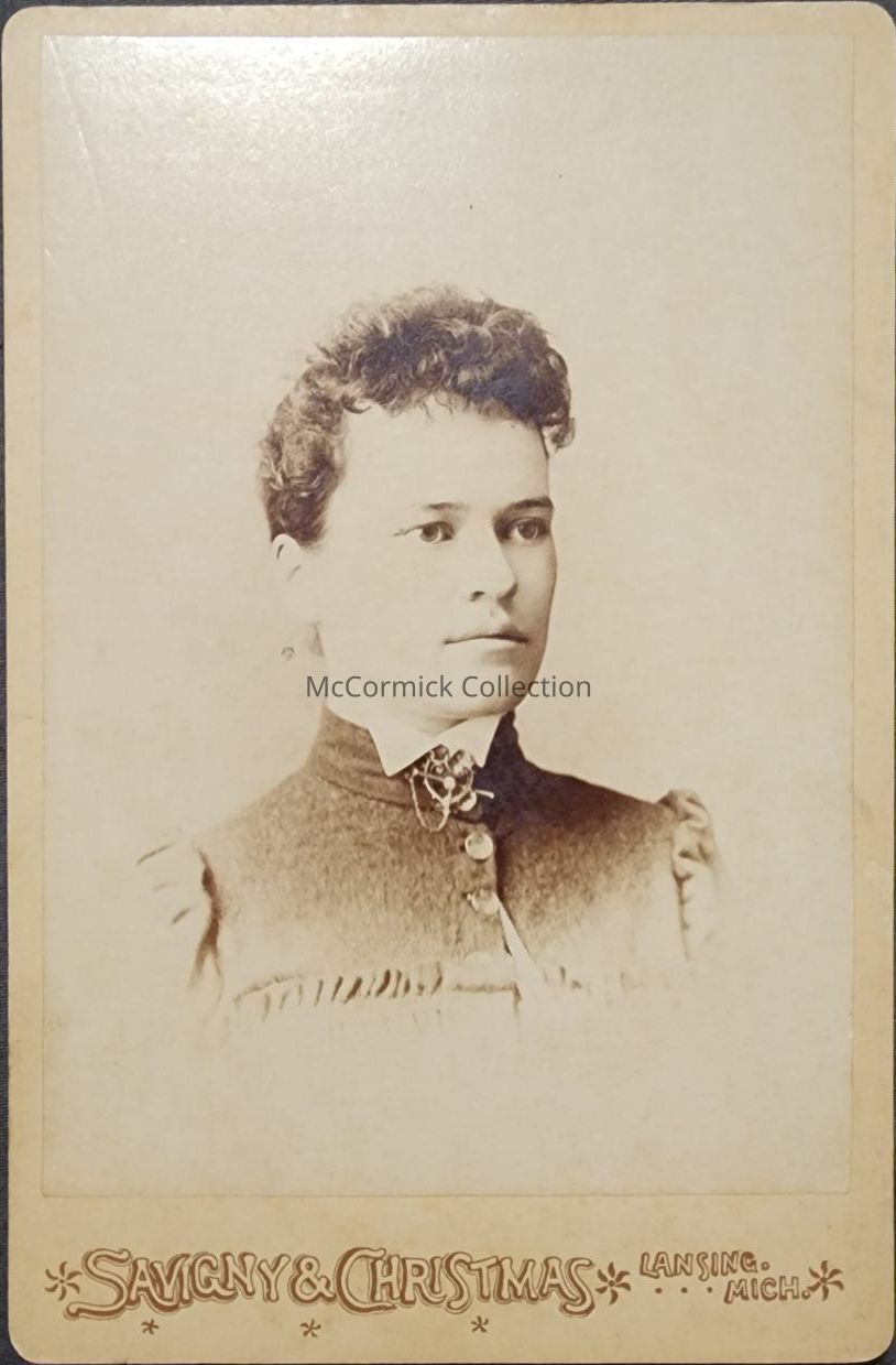 Cabinet card photograph of an unidentified woman by Lansing photographer Savigny and Christmas.