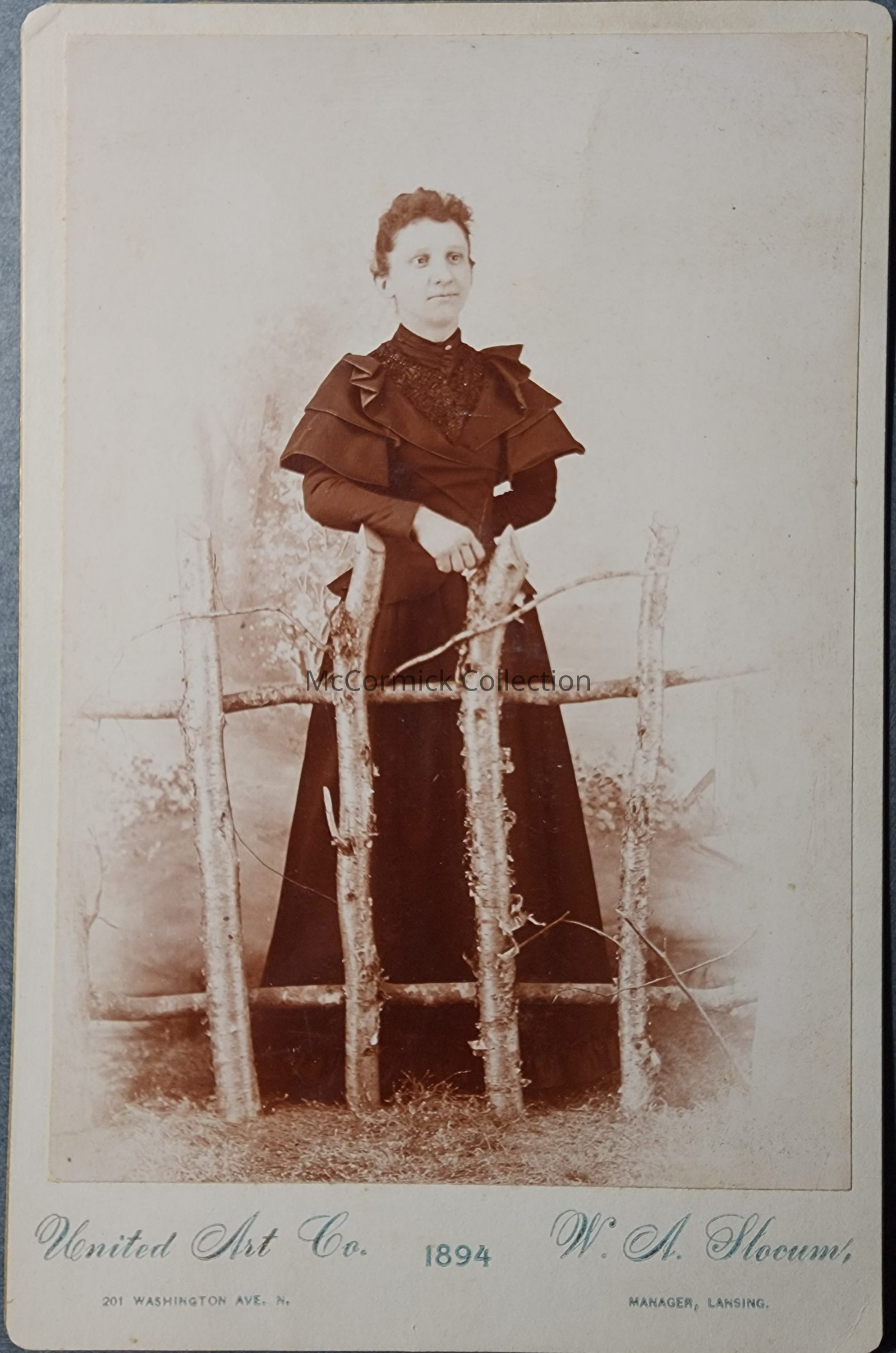 Cabinet card photograph of an unidentified woman by Lansing photographer W.A. Slocum, manager, United Art Co., 1894.