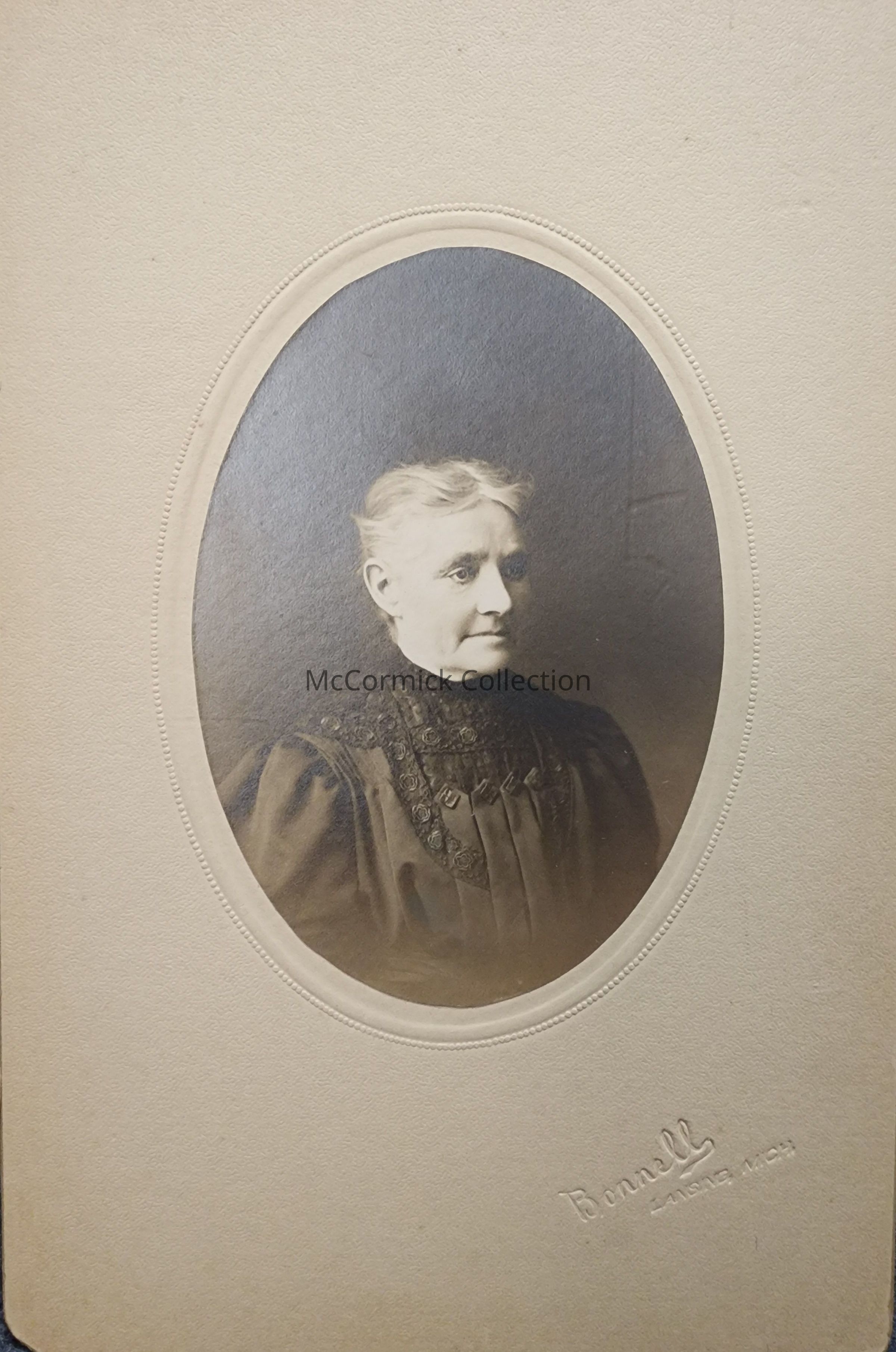 Card mounted photograph of an unidentified woman by Lansing photographer Bonnell.