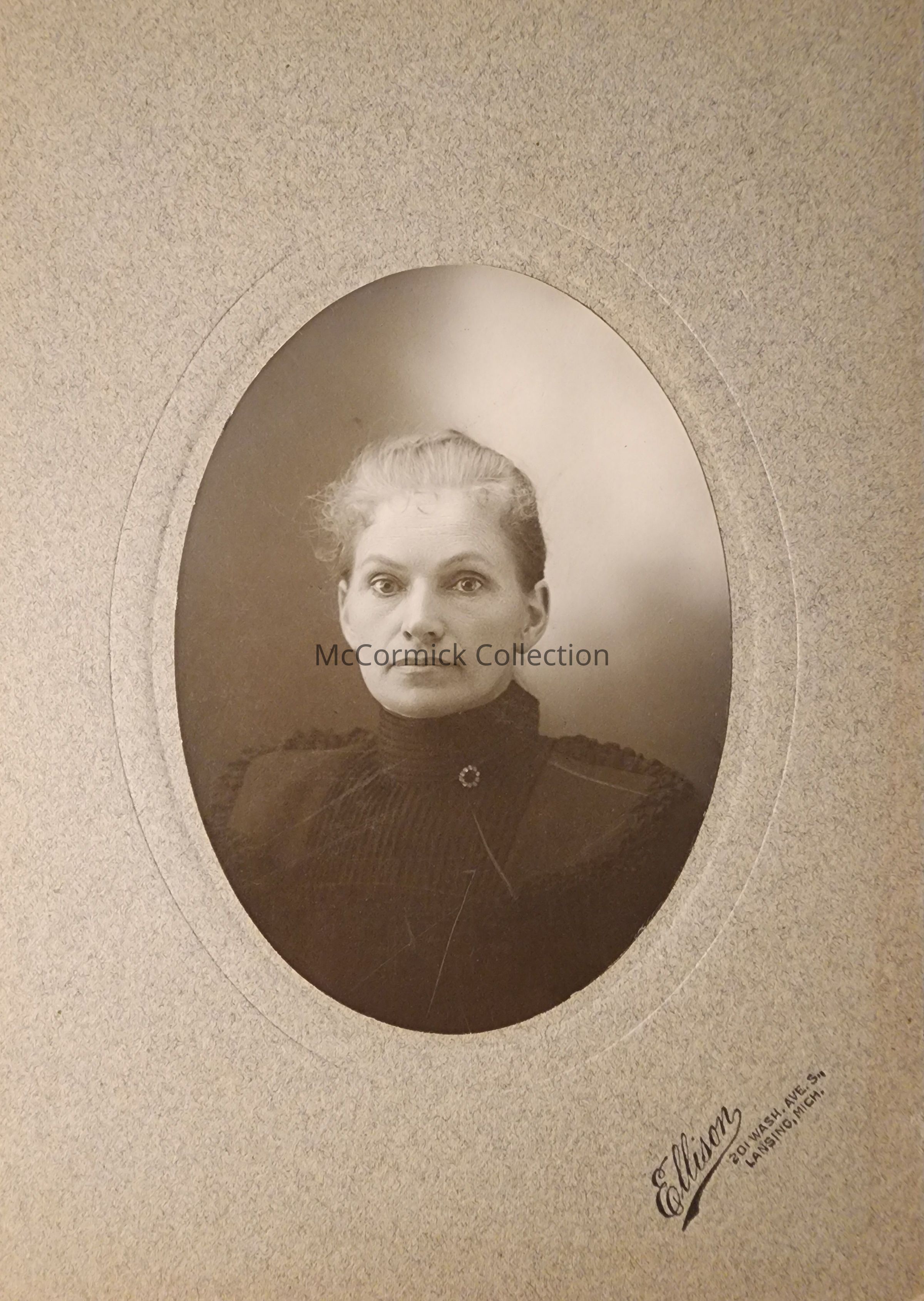 Card mounted photograph of an unidentified woman by Lansing photographer Ellison.