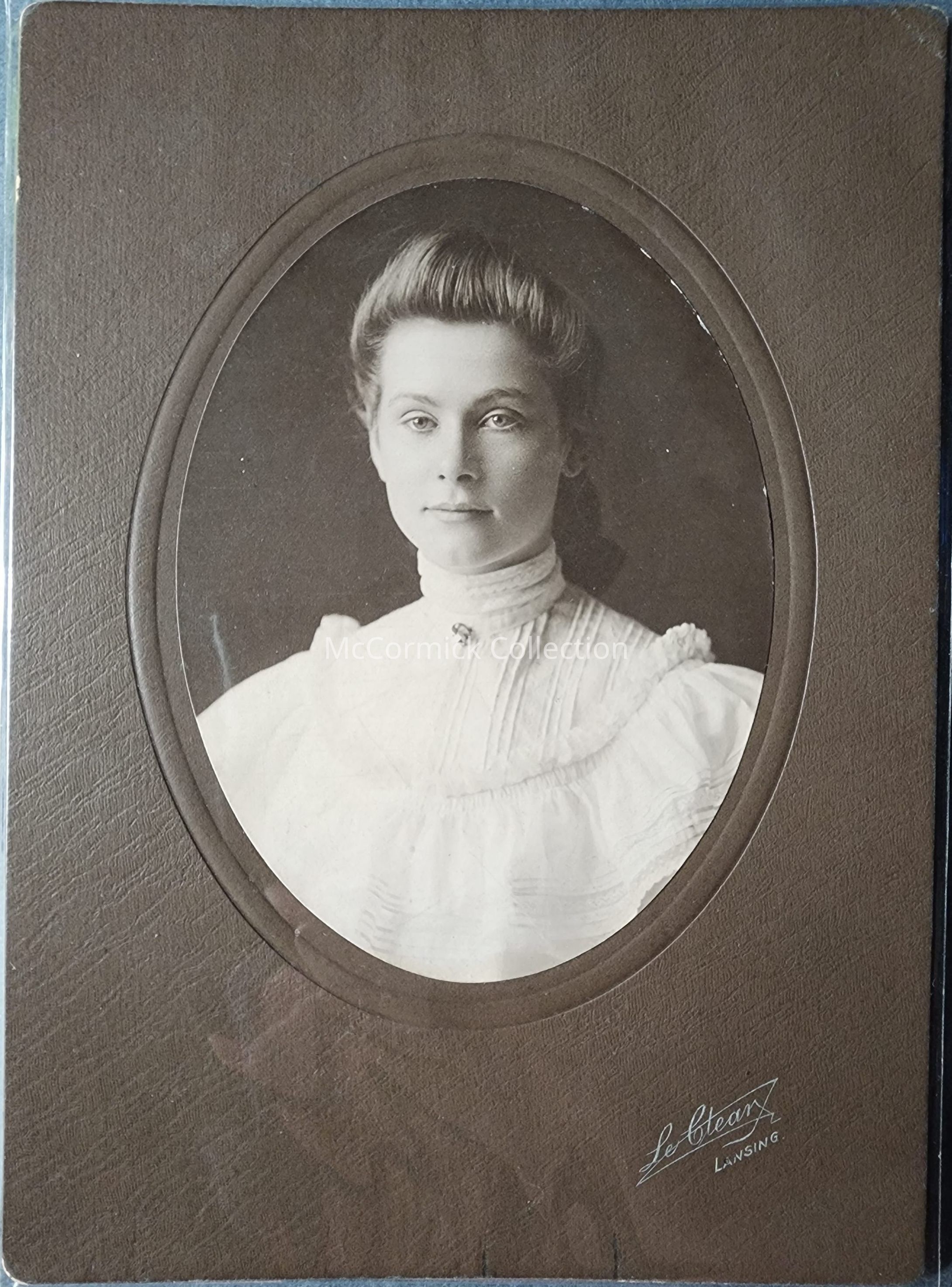 Card mounted photograph of an unidentified woman by Lansing photographer LeClear, circa 1900s.