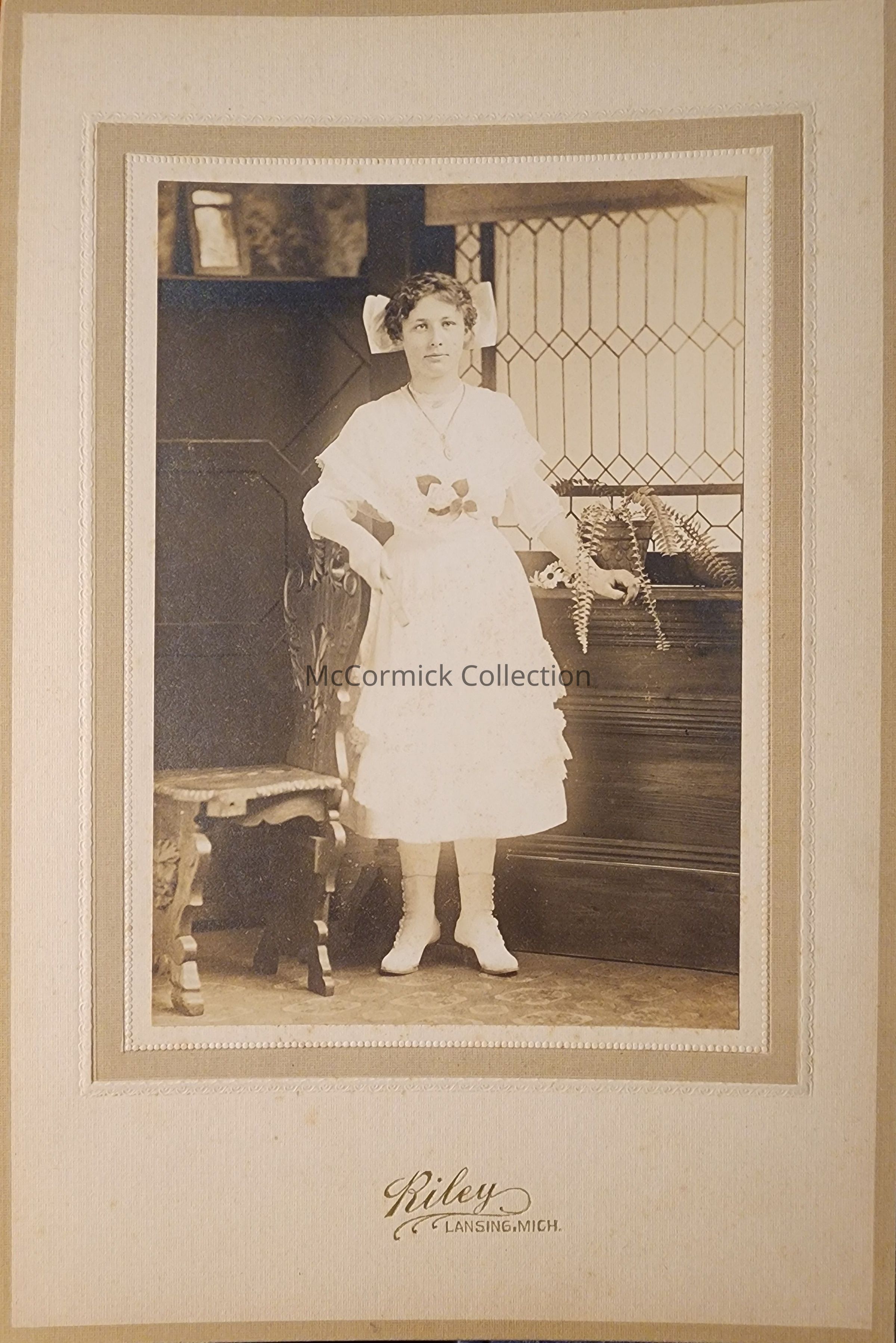 Card mounted photograph of an unidentified woman by Lansing photographer Riley.