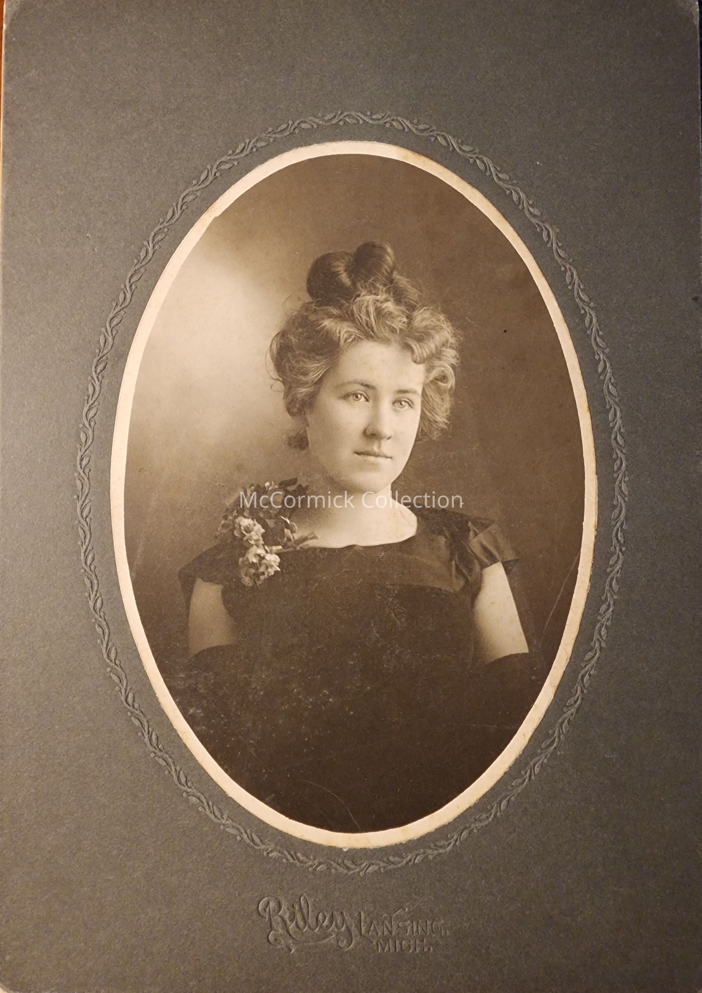 Card mounted photograph of an unidentified woman by Lansing photographer Riley.