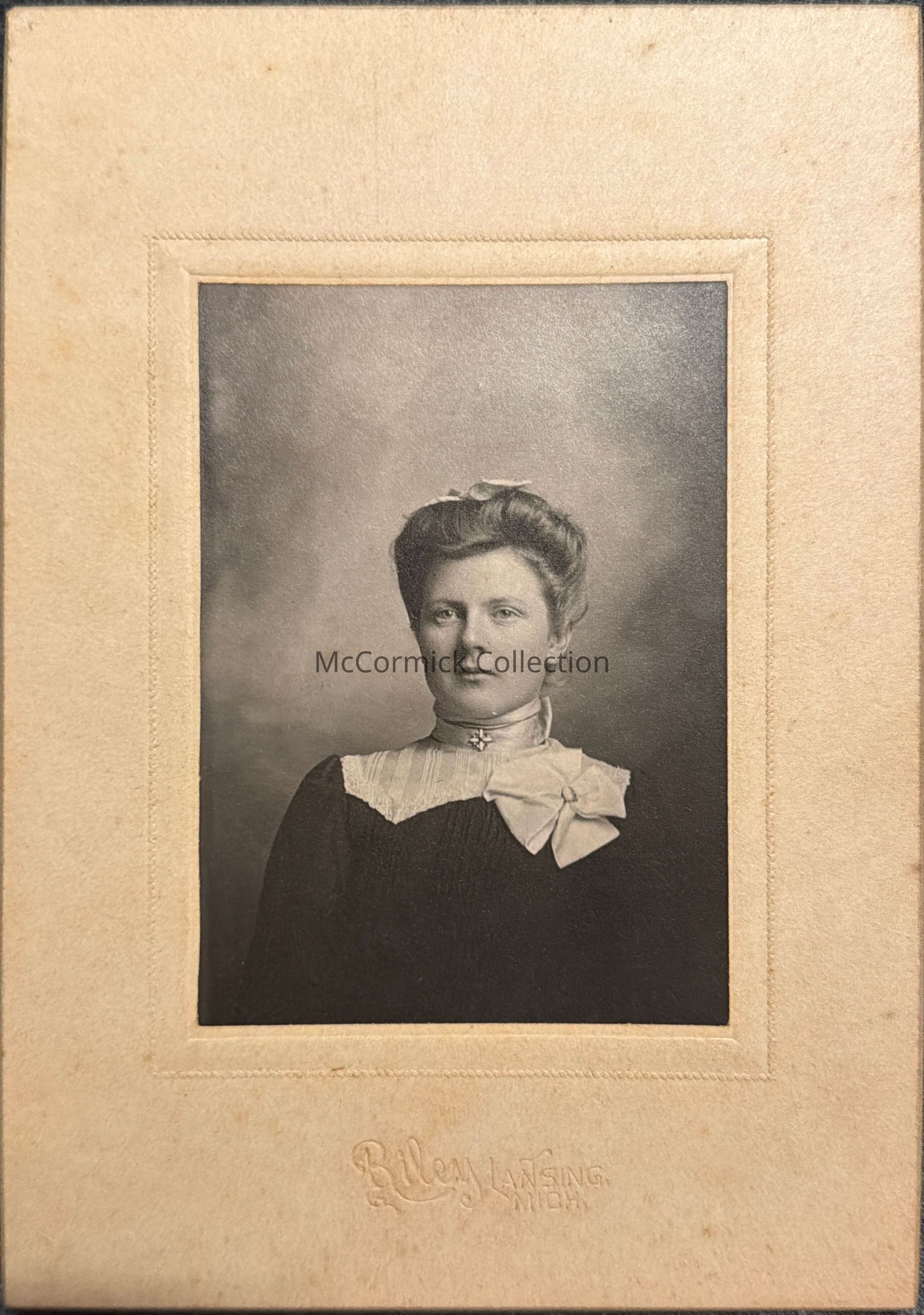 Card mounted photograph of an unidentified woman by Lansing photographer Riley.