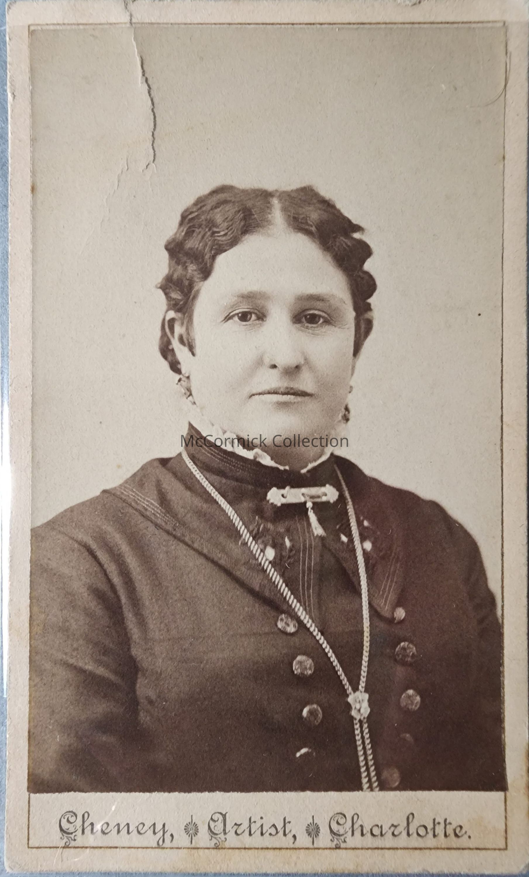 Carte de visite photograph of an unidentified woman by Cheney of Charlotte. A.M. Cheney also worked in Lansing.