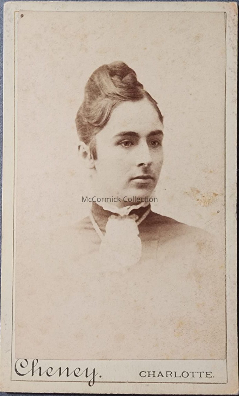 Carte de visite photograph of an unidentified woman by Lansing photographer, working in Charlotte, A.M. Cheney.