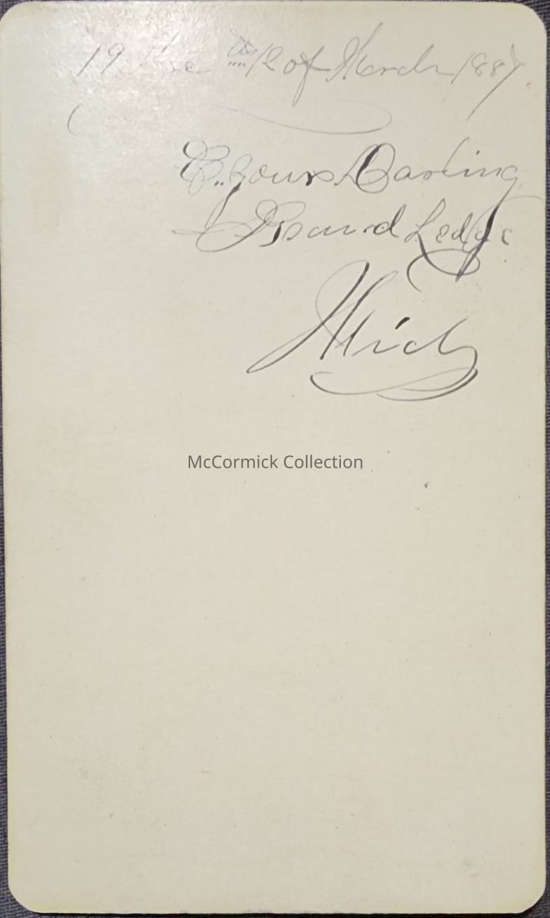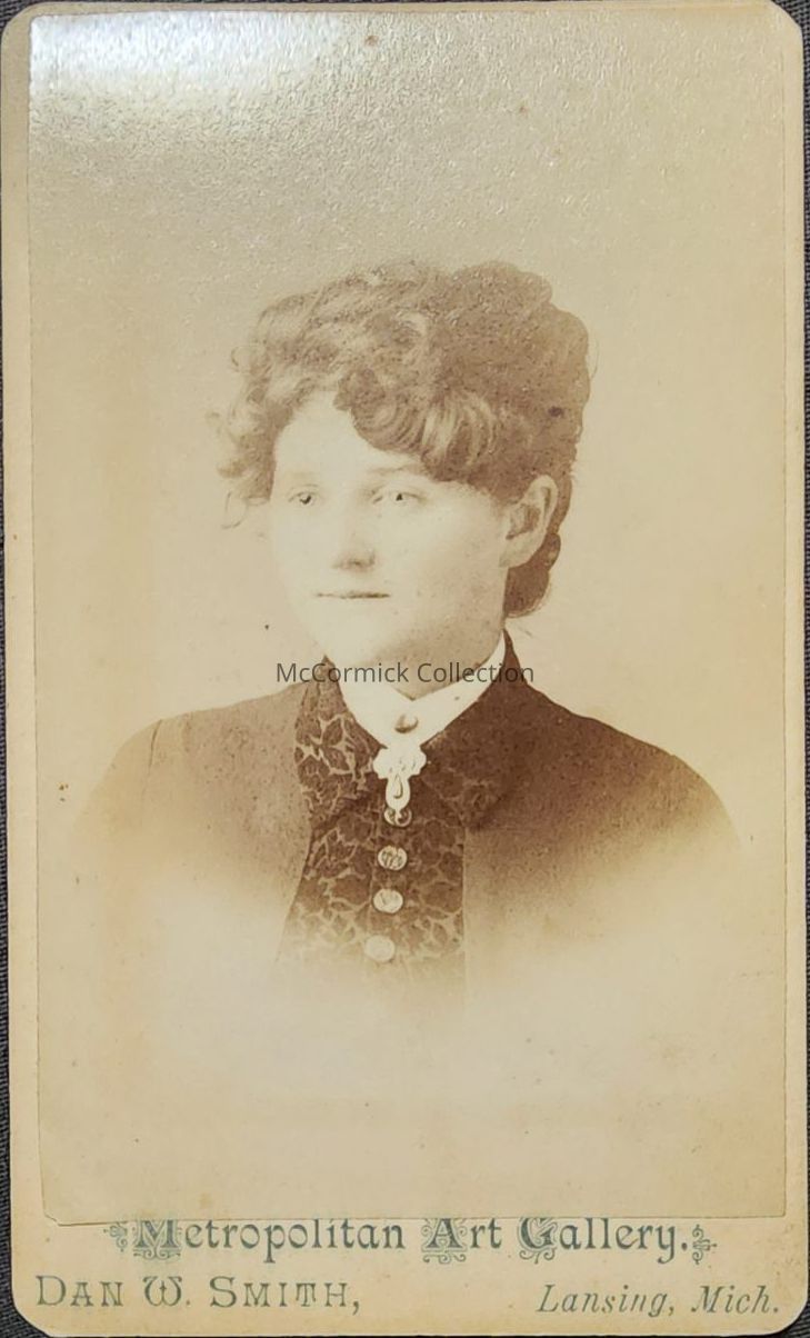 Carte de visite photograph of an unidentified woman by Lansing photographer Dan W. Smith, Metropolitan Art Gallery. Dated March 12, 1887 on the back and signed "Your Darling, Grand Ledge, Mich."Made/Created