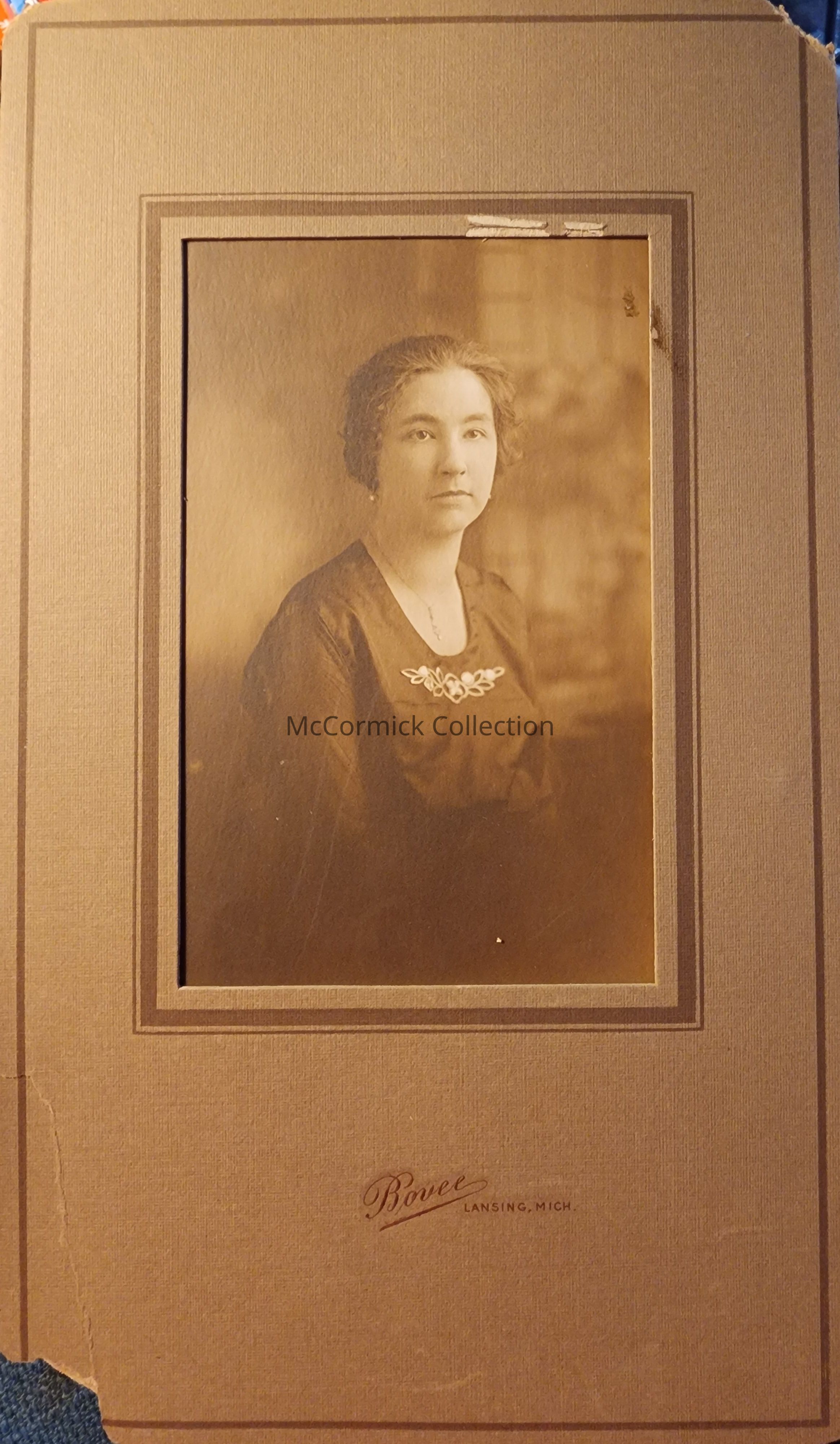 Folder frame mounted photograph of an unidentified woman by Lansing photographer Bovee.