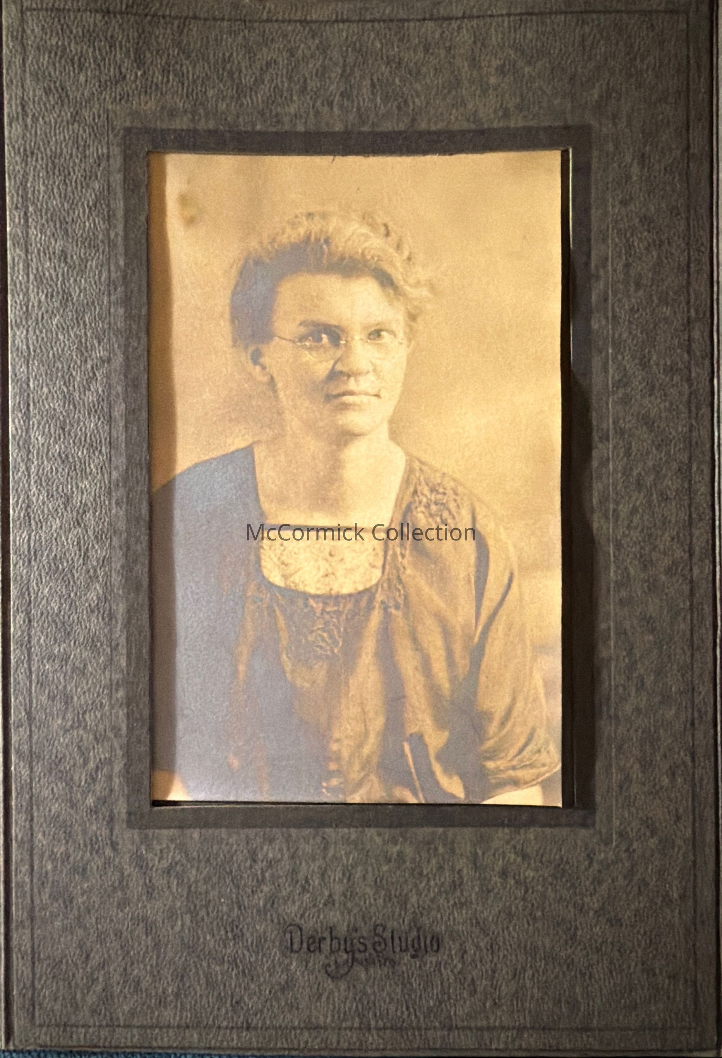 Folder frame mounted photograph of an unidentified woman by Lansing photographer Derby. Possibly Annie Miller.
