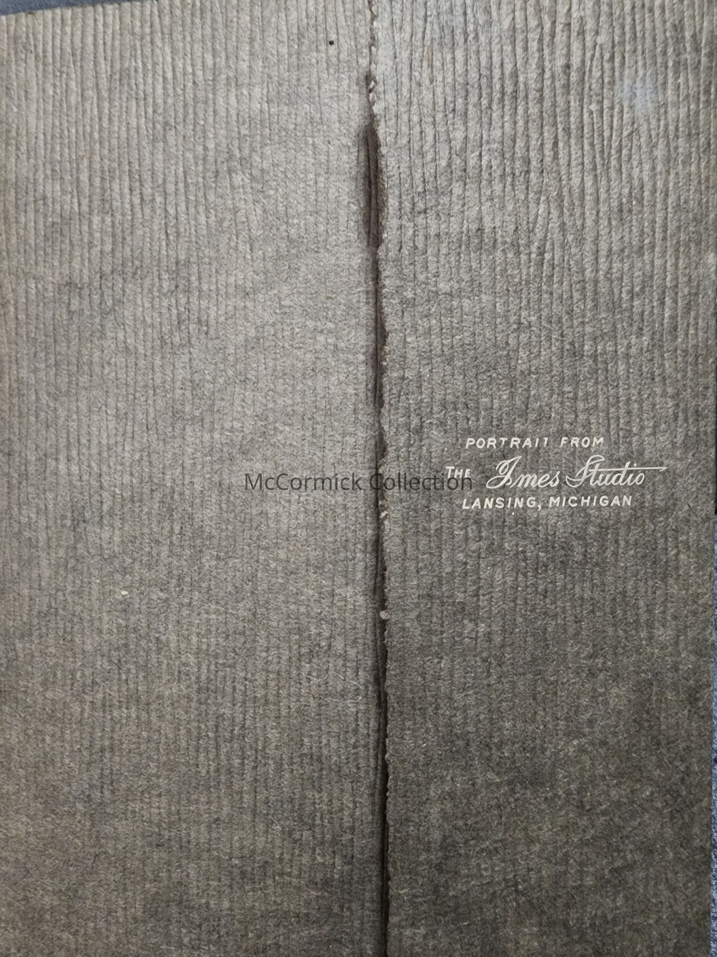 Folder frame mounted photograph of an unidentified woman by Lansing photographer Imes.